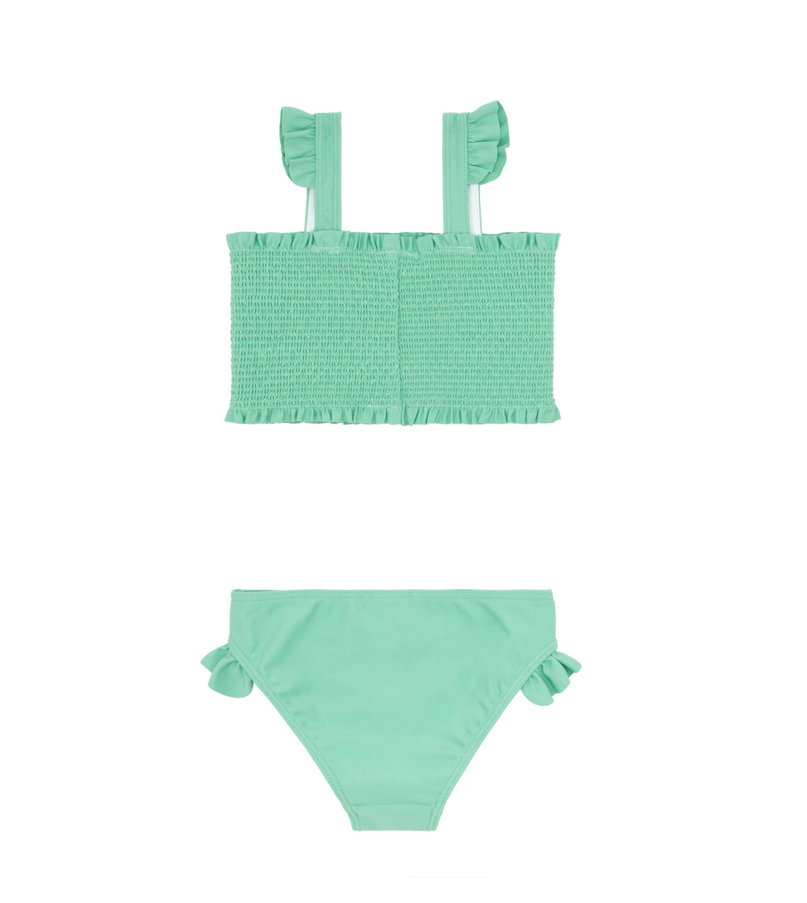 this girls bikini in our fresh abaco green has sweet smocking on the top and a delicate ruffle details on the straps and matching bottoms. this suit is ready for memories in the sun!