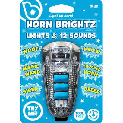 Announce your arrival in style! Hornbrightz is a LED bicycle horn with 12 fun sounds! Find your sounds, turn on the lights, and ride on. Easy installation, no tools required. Requires 2 AAA batteries. Sounds include: Ring Bell, Bike Bell, Siren, Fire Engine, Trucker Horn, Back-Up Beep, Motorcycle, Magic Wand, Cat, Dog, Cow, Horse