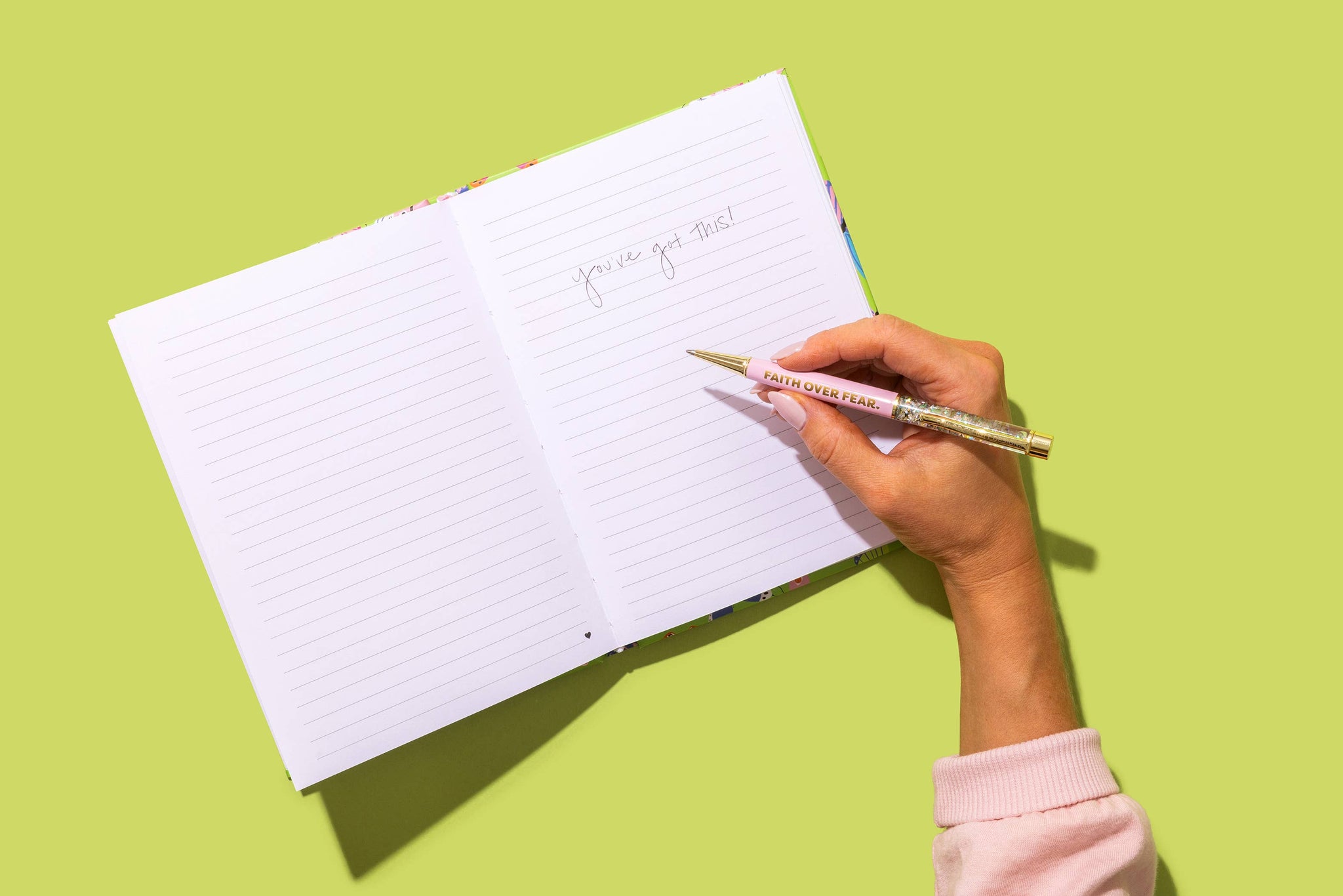 Make life a little more fun with our Confetti Pens! Filled with colorful confetti, adorned with gold metal accents and including the phrase "Faith Over Fear", they look as beautiful as they write. These pens are packaged to be sold individually. Put them in a jar by the register for quick add-ons to notepad purchases or tie them together with a notebook for a giftable bundle. Details * 1 confetti pen * Imprinted with "Faith Over Fear” * Medium ball point pen * Black ink * Gold metal accents * Confetti inside pen matches our pearl confetti collection * Liquid inside pen is water * Twist pen tip to use * Imported