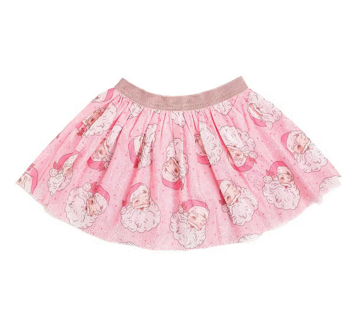 The Retro Santa Christmas Tutu is a fun skirt and dress up tutu for celebrating Christmas! Features: * Pink tulle printed with a retro santa pattern * Pink cotton lining * Pink glitter waistband * Care: Hand wash and line dry