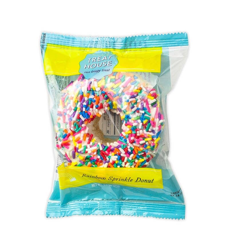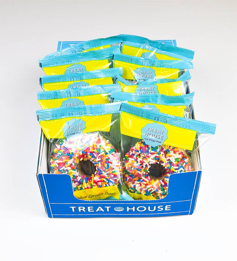 Old fashion “cake donut” flavored treat topped with white ganache and rainbow sprinkles. Shelf life 5 months, box of 12, gluten free.