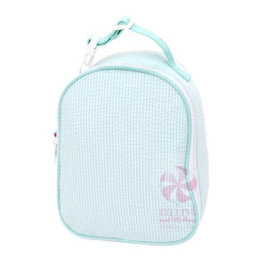 This is the new lunchbox--The Gumdrop! It's lined inside with our new and improved fabric...it has a little net to hold utensils and a napkin inside along the back wall. The front pocket zips almost all the way open for easy personalization for my customers who personalize with stitches. This new bag doubles as a great bag for baby--it can carry a bottle and baby food and keep it all chilly! Top strap has a ladder lock buckle to make it easy to clip on to backpacks and strollers.