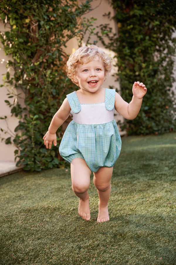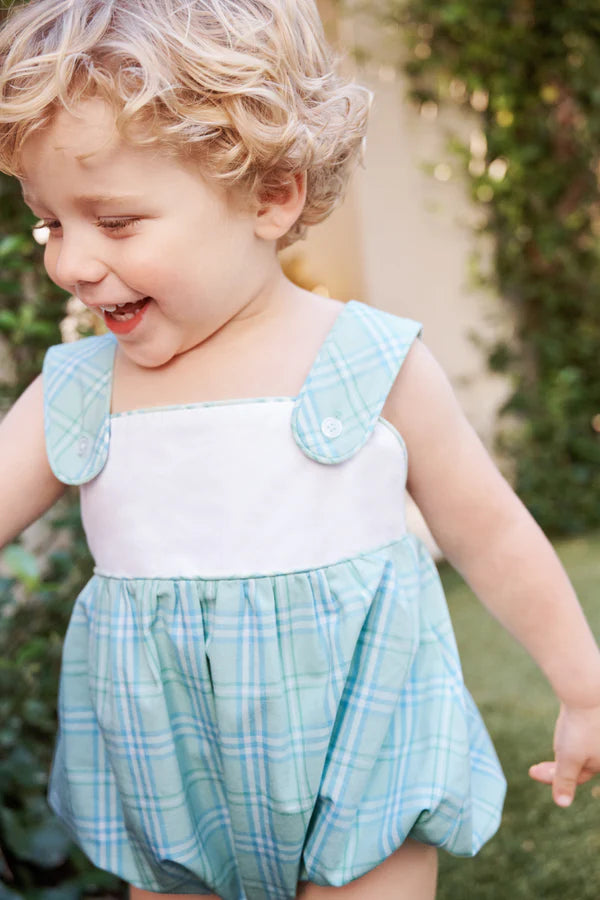 This dapper Bingham Bubble in Pelham Bay Plaid (Green) with Worth Avenue White is the outfit that makes your little gentleman look ready for anything from Easter brunch to family photos! The timeless green plaid brings preppy style while the bubble silhouette gives him room to explore and play comfortably. It's the kind of outfit that gets compliments everywhere you go and makes you want to take a million pictures—because when he looks this handsome, you can't help yourself!