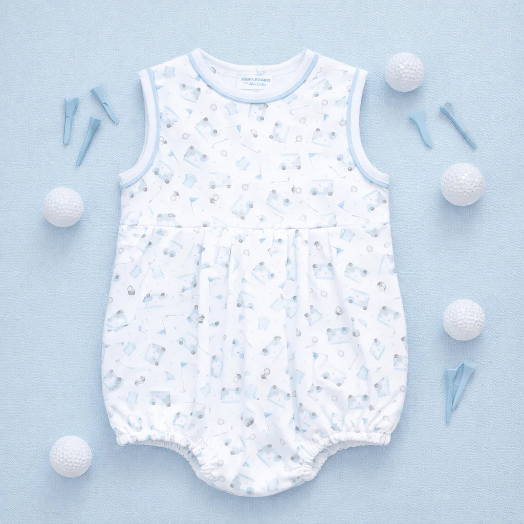 This charming Pima Cotton bubble is ideal for sunny outings at the club and special spring celebrations. With a delightful all-over golf print and masculine light blue trim, it offers the ultimate combination of premium comfort and high-end style for your little gentleman. The breathable, airy silhouette ensures he stays cool while looking perfectly polished for family photos or brunch on the terrace.