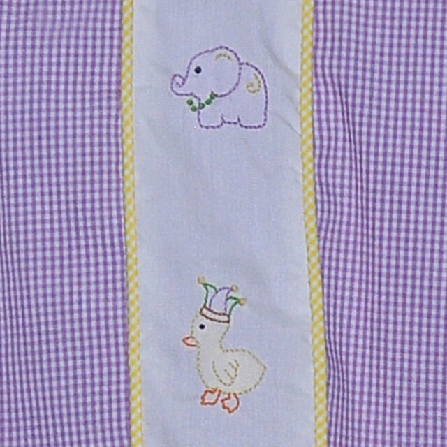 our first ever Mardi Gras collection! Baby boy will scream, "Throw Me Something Mister," while wearing the Mardi Gras Parade Boy Bubble. Adorned with a trio of hand-stitched shadow embroidered animals-an elephant with Mardi Gras beads, a duck with a Mardi Gras jester hat, and a giraffe holding a Mardi Gras balloon, this collection is a must have for carnival time! The yellow piping pops against the lavender gingham fabric and buttons at the back and snaps underneath to assist with dressing. Happy Mardi Gras Everyone!