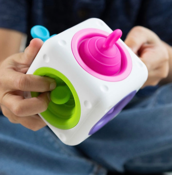 Built into each side of this sturdy, rounded cube is a soft silicone bubble with a tab to grab and pull. Fingers can't help but push them, pull them, and pop them again and again.