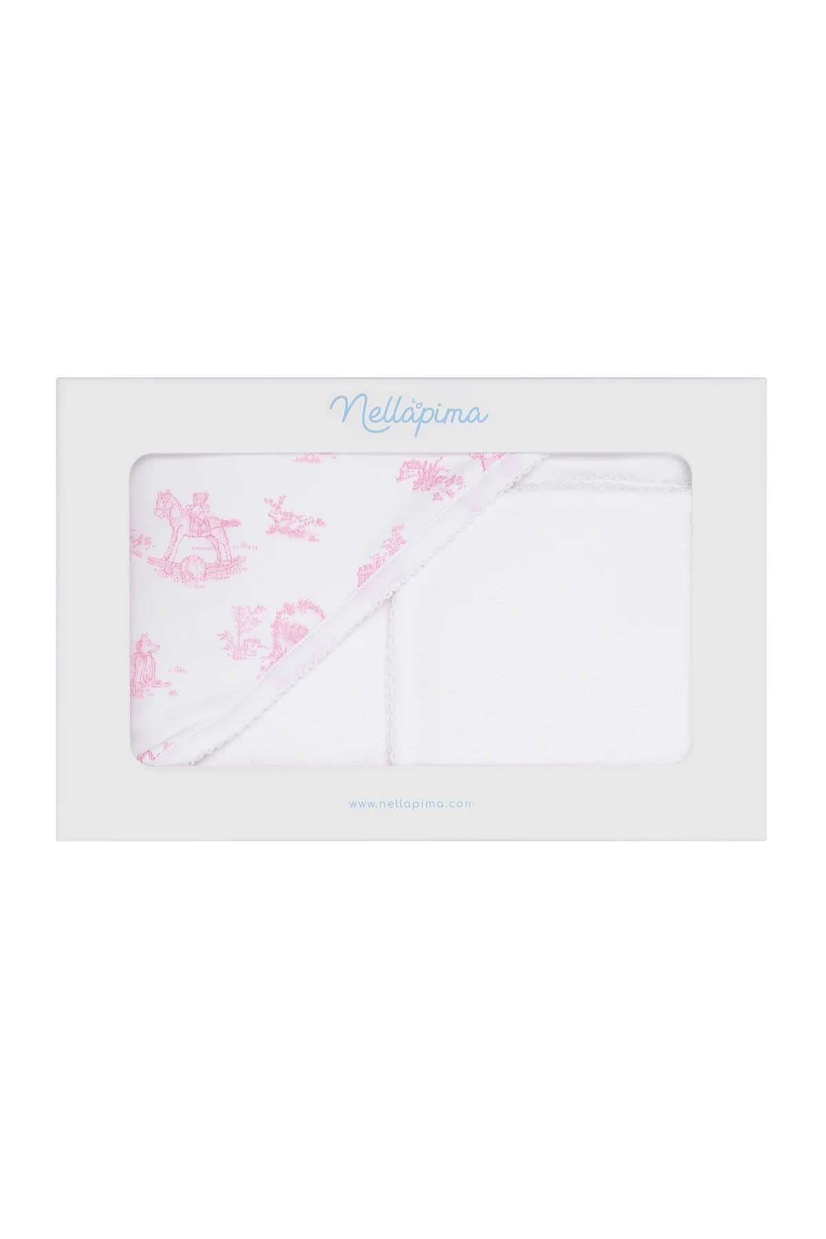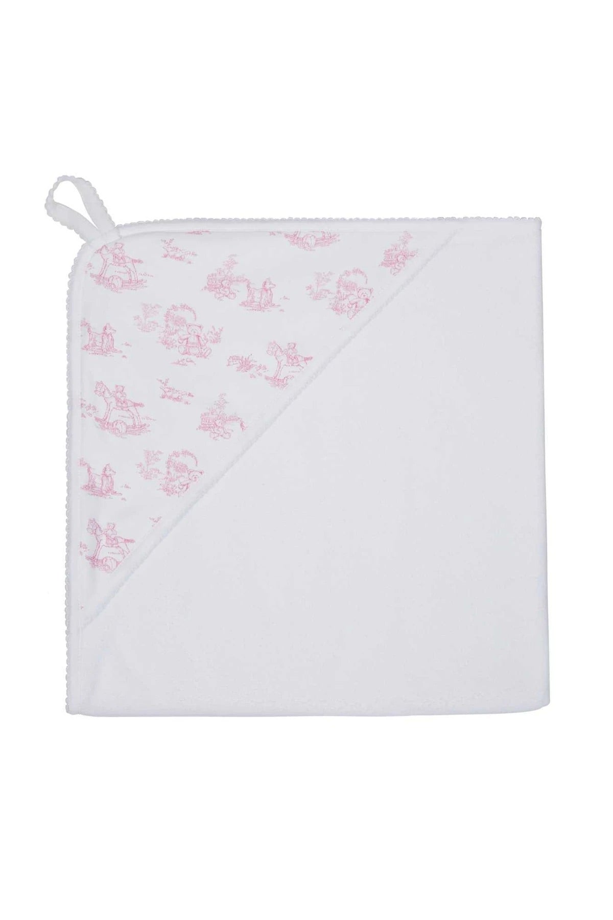 Our Toile Hooded Towel set is made of 100% Peruvian cotton. The hood has a pima cotton applique made of pink Tolie fabric.