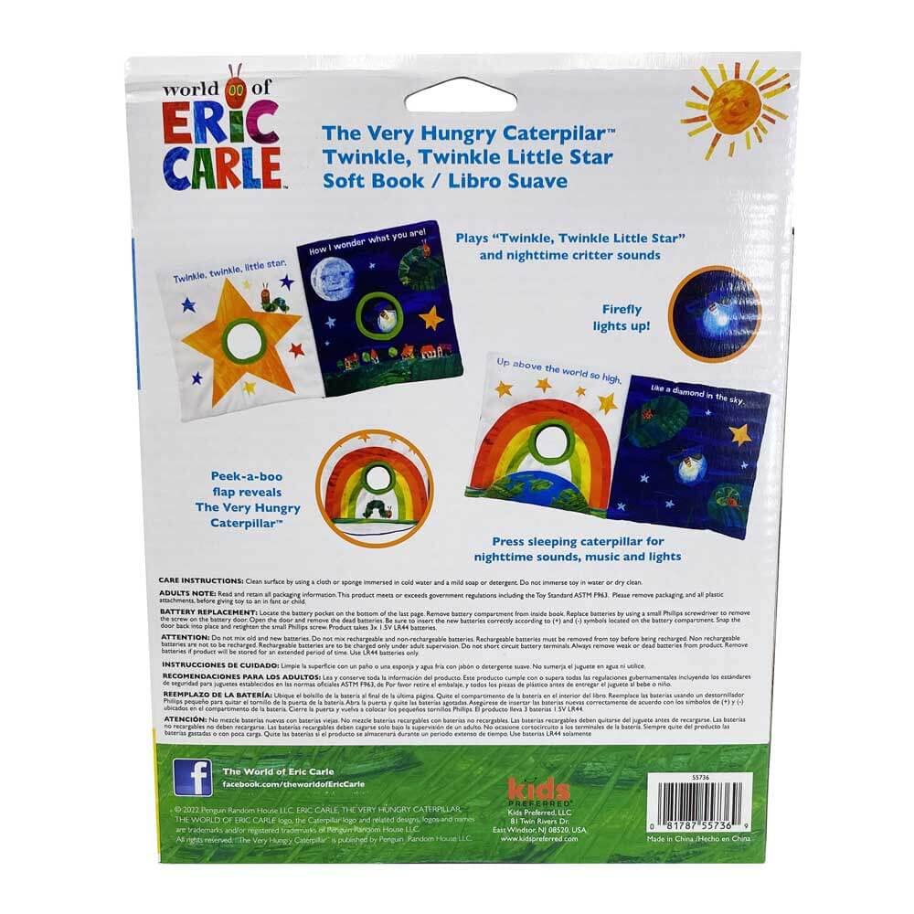 Follow The Very Hungry Caterpillar as he works his way through this Twinkle Twinkle Little Star soft book on his way to see the firefly light up! This soft book includes both sounds and lights. Press the sleeping caterpillar on the last page to hear nighttime critter sounds and to hear the song Twinkle Twinkle Little Star. Press again to see the firefly light up. Includes replaceable batteries - 3 x LR44 button cell, Appliqued materials, Crinkle and a Peekaboo flap. Surface Wash. Appropriate for ages 0+.