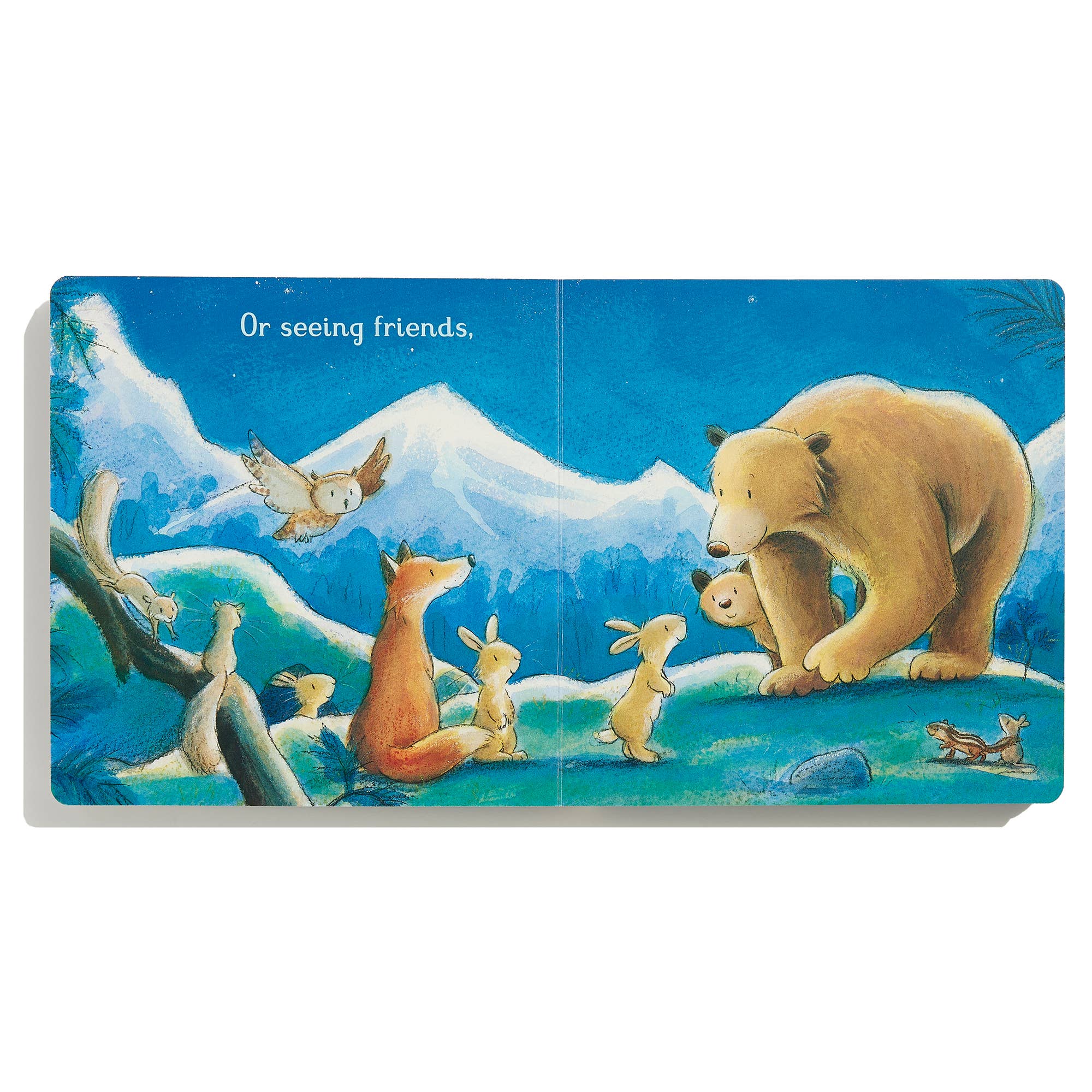 The sun rises, and a bear and cub begin their day together. They splash in the water, climb mountains, watch the colorful lights in the shimmering sky, and play with friends. They show their love for each other by touching noses, chasing each other, and, of course, hugging and snuggling before bed.
