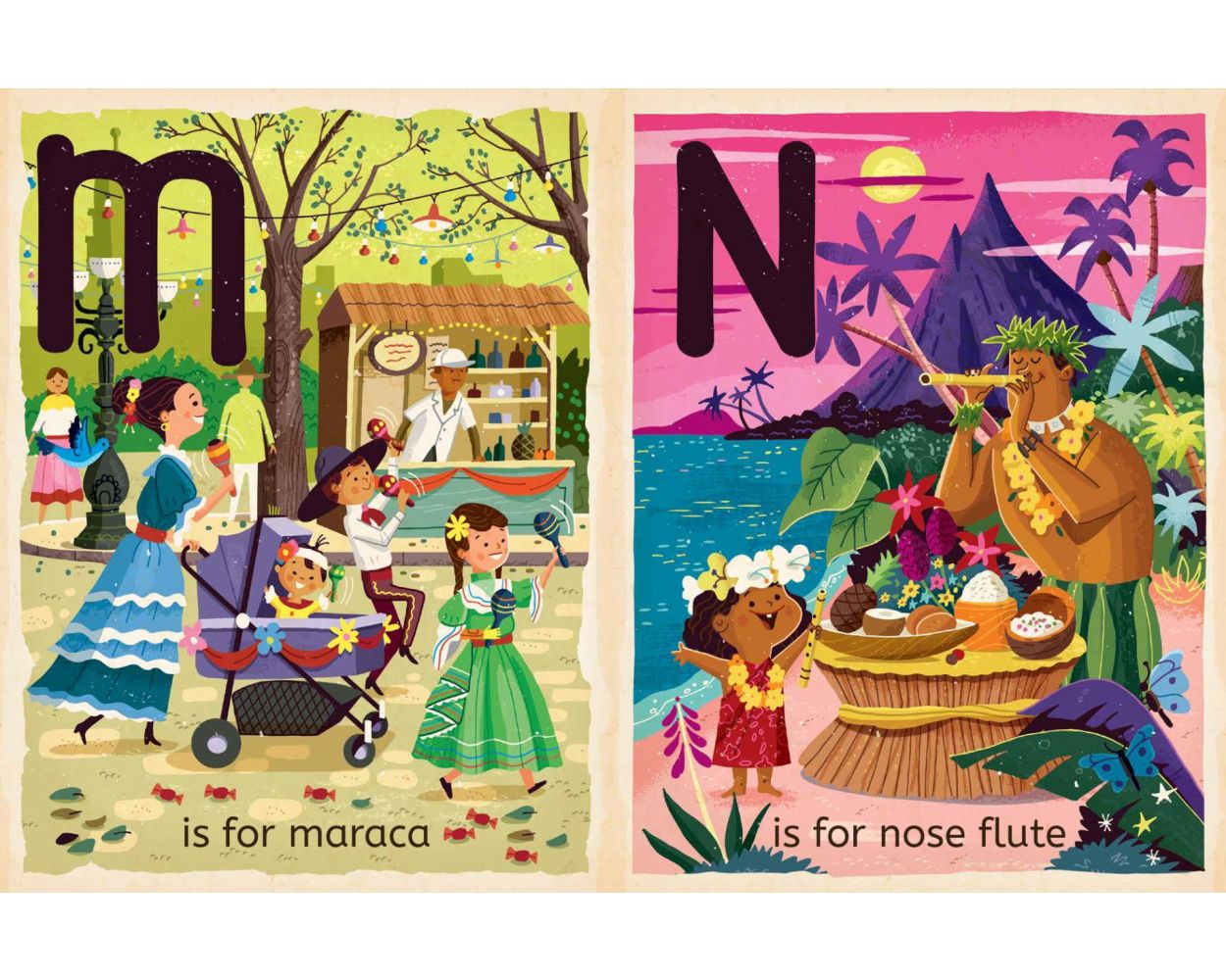 F for flugelhorn, M for maraca, and T for tambourine: Illustrator Greg Paprocki’s engaging retro illustrations present the world of music, from the piccolo to the nose flute, from the veena to the ukulele. Each page contains rich cultural elements from the instrument's region of origin.