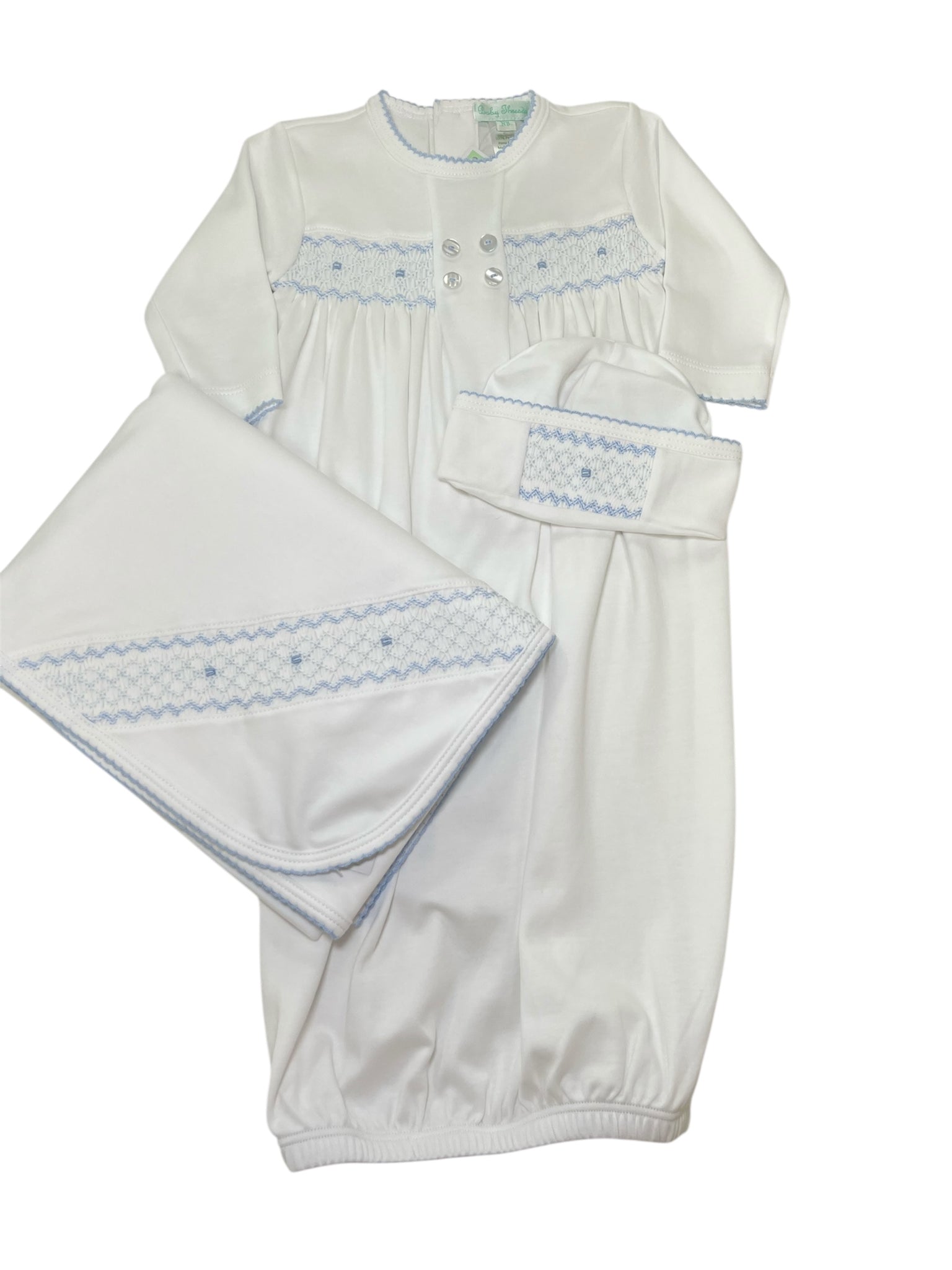 White with blue smocked hat