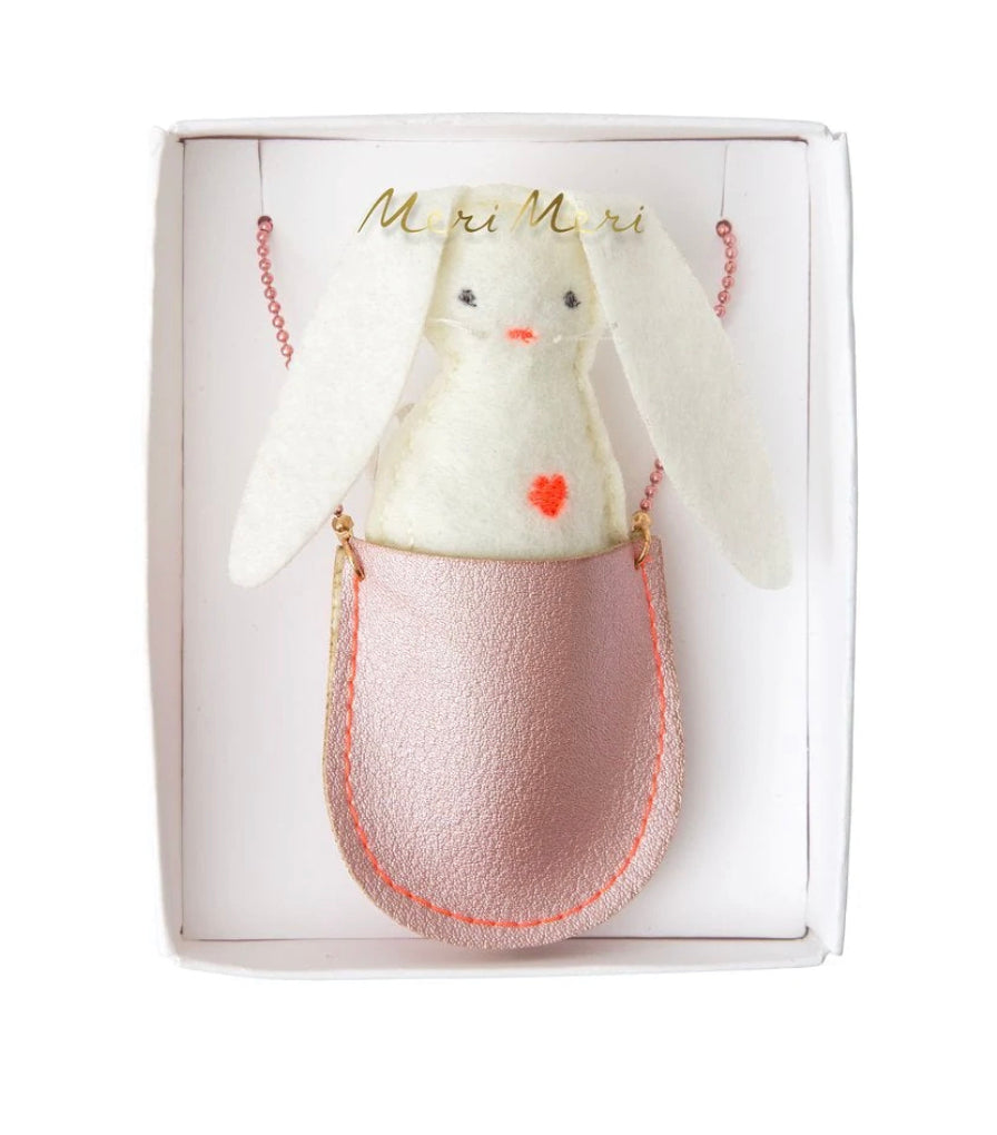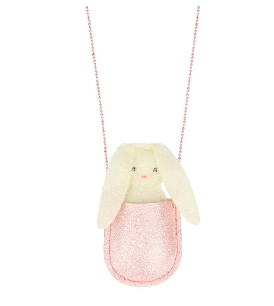 This adorable necklace is perfect as an Easter or springtime gift. It features a cute padded felt bunny in a glittery pink pocket, and is hung with a pretty pink bead chain.