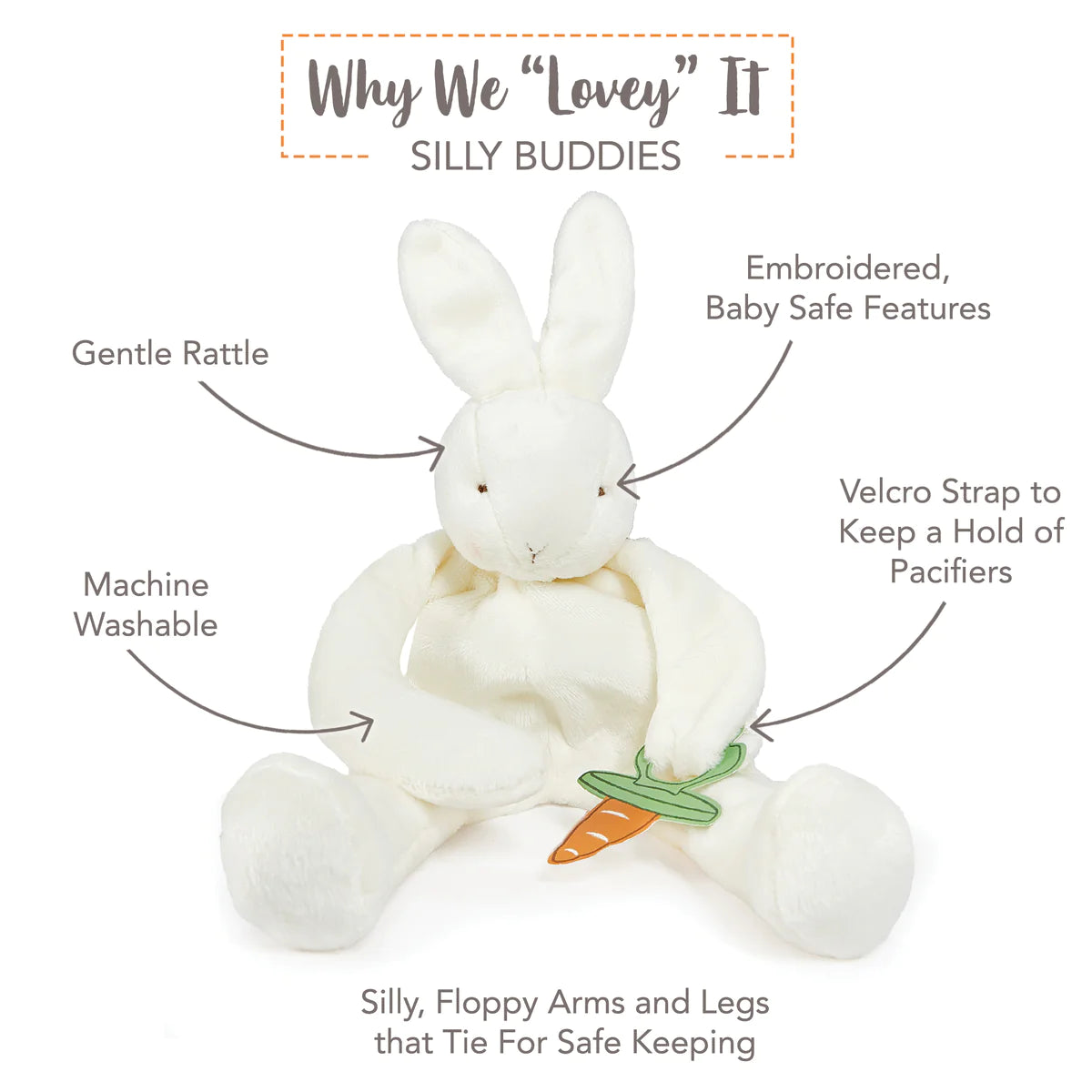 The perfect gift for your wee one with multiple ways to soothe. Super-soft and floppy, super silly, and oh so useful, this take -a-long pal will tie onto baby's stroller, crib or car seat. With pacifier holder hand loop and fun rattling head, this is sure to be a favorite security item of Baby and Mom and Dad alike! Signature three carrot tag for little one's fingers.