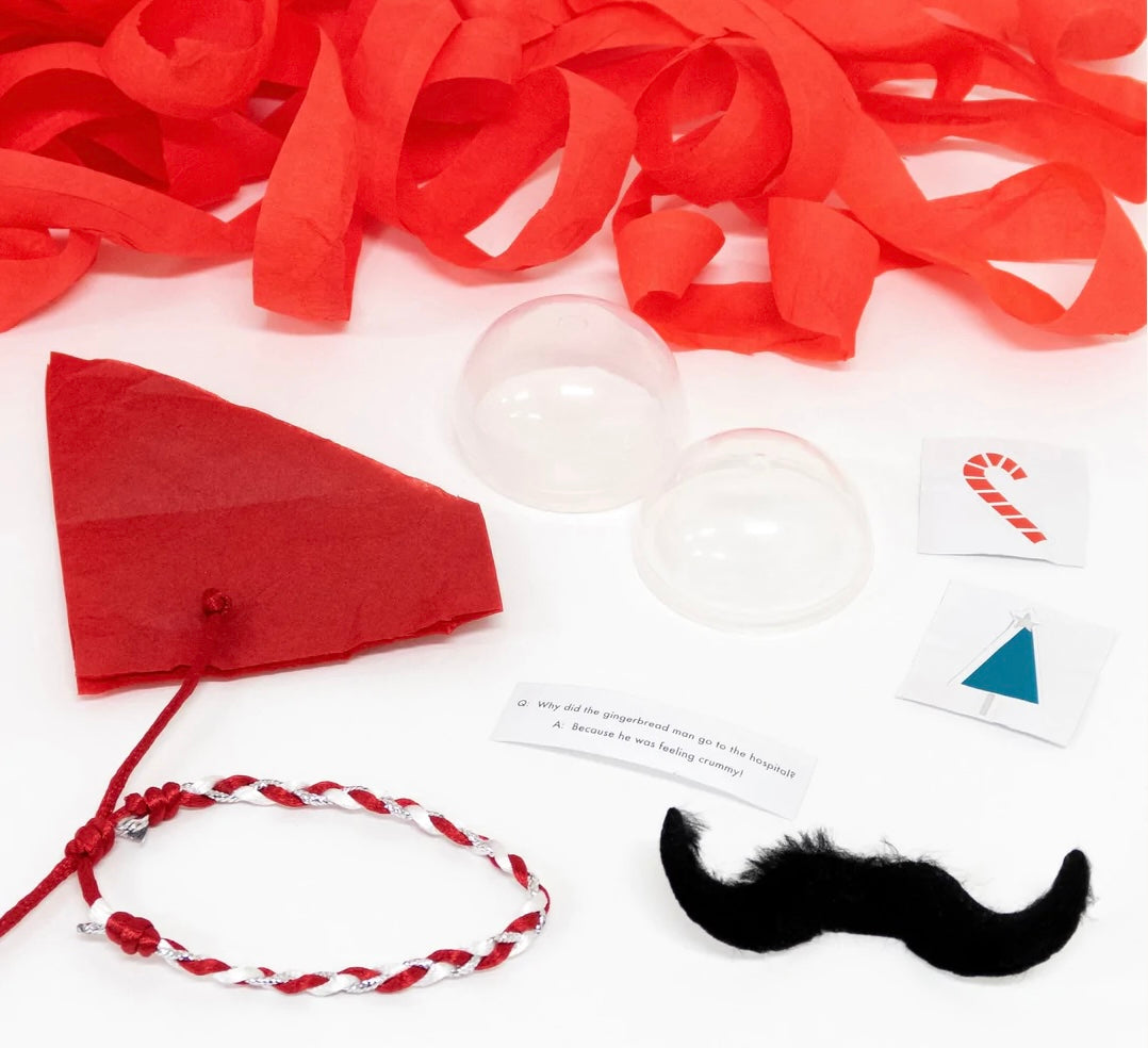 If you want to give your family and friends a fun surprise treat, then pop these fabulous balls at your place settings. They are crafted with traditional red and silver festive colors, and unwrap to reveal a paper hat, joke, self-adhesive mustache, 2 stickers, and a friendship bracelet. They are excellent to use as stocking fillers or as party bag treats too.