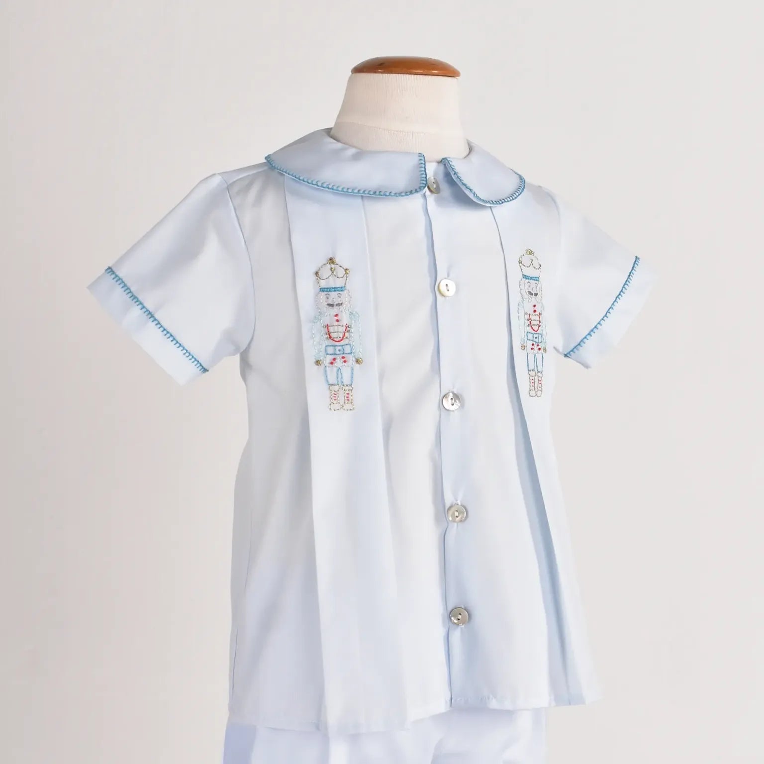 We proudly bring you all the magic and beauty of a classic Christmas favorite with our Signature Holiday Collection, The Nutcracker! This truly exquisite collection sweeps back the velvet curtains of the theater to bring to life the most adorable hand embroidered Nutcrackers, featuring exquisite craftsmanship that brings out the unique beauty of every piece. Everything about this special Collection has been carefully curated and was carefully designed to highlight even the tiniest of handmade details that make it an astonishing work of art. Meticulous hand embroidery in tones of gold, silver and shimmering pastels reflect the joy, beauty and innocence of childhood. Delicate finishing touches such as the bright blue blanket hand stitching on its collar and sleeves stand out beautifully against its soft blue cotton batiste fabric. Its shorts come fully lined and its shirt buttons at its front with mother of pearls. A one of a kind Manolitas timeless design, entirely handcrafted by our talented team of local artisans who lovingly bring this darling keepsake to life. This collection is the result of our passion for intricate hand embroidery.