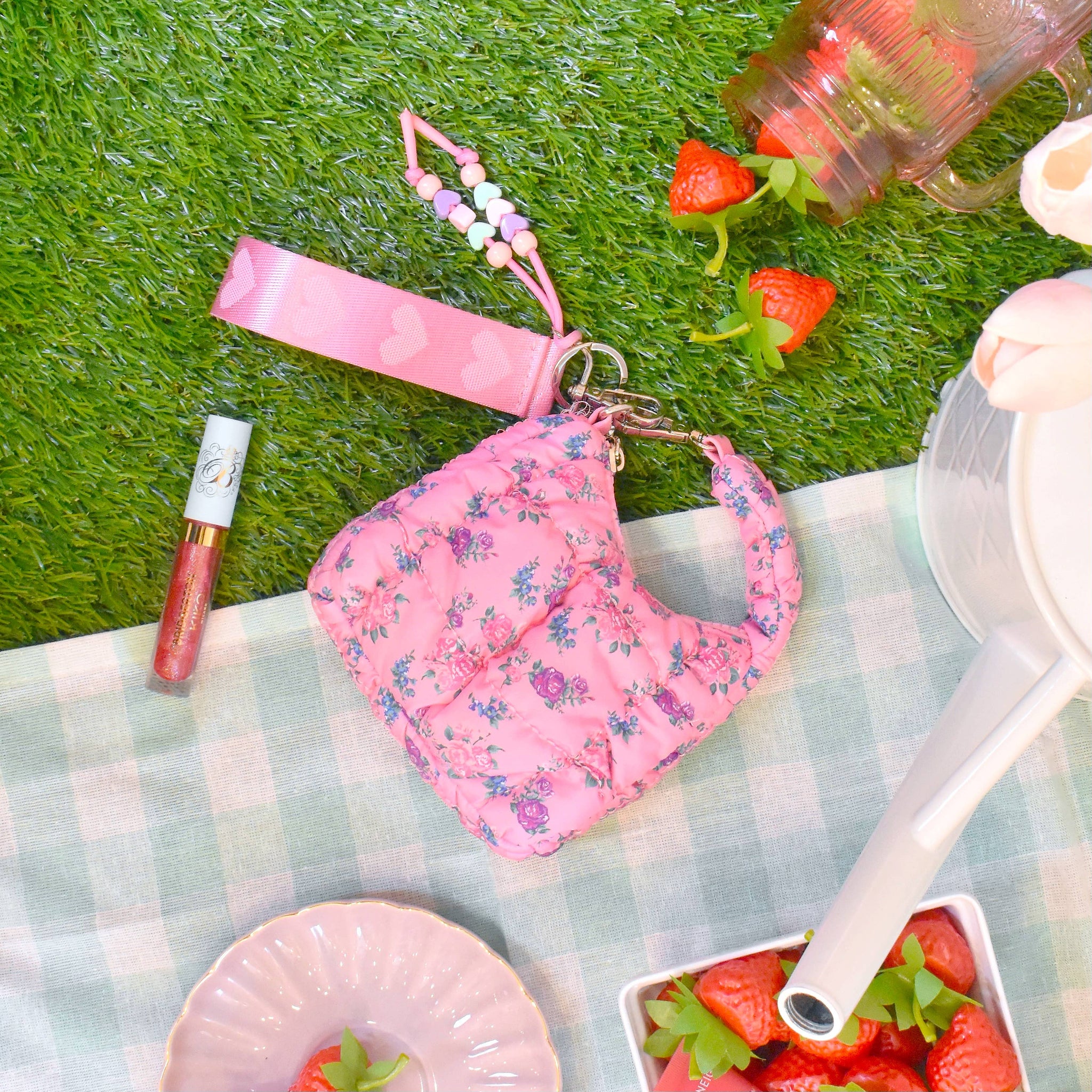 Adorn your favorite bags with the our newest bag charm set! With its cute crescent shape and a darling floral pattern, it's the perfect accessory for your accessories! Comes with the pouch itself and a detachable hearts printed wrist strap for extra functionality.