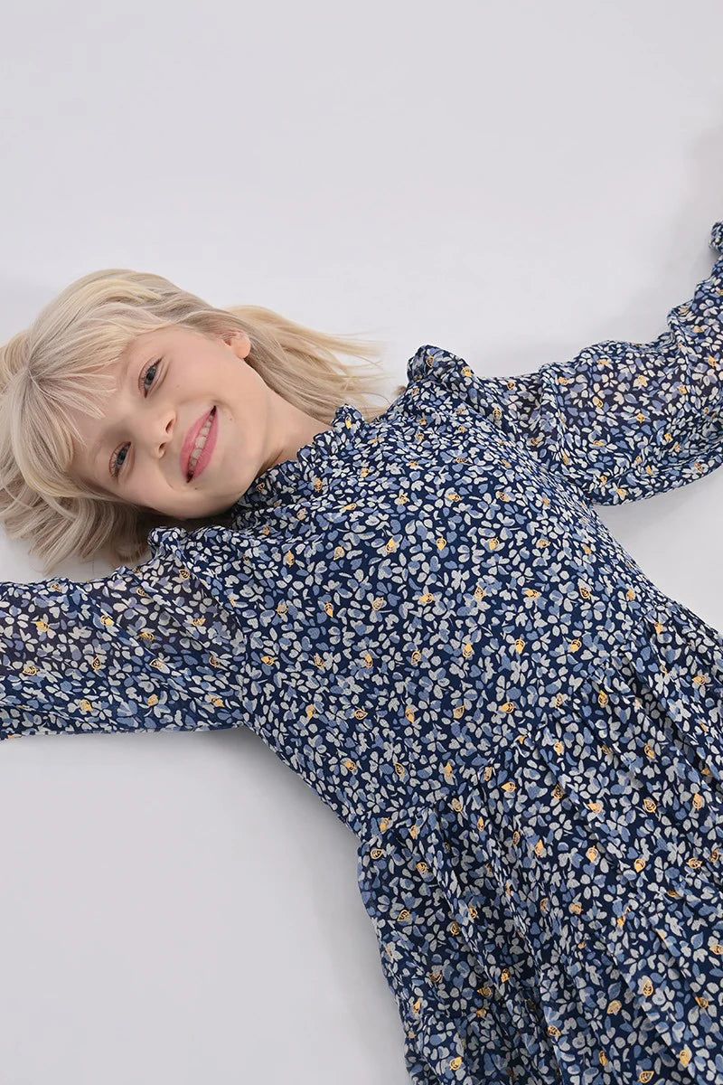 Short dress, floral print-Long sleeves, rolled up cuffs-Semi-high neckline, gathered-Multi-ruffles on the bottom of the skirt-Semi-transparent veil-Invisible zip closure at the upper back-Length 30.7 inch from the shoulder for a 12 year old