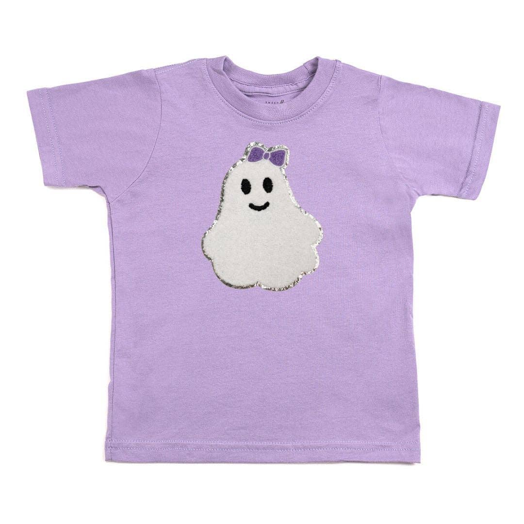 The Girly Ghost Patch Halloween Short Sleeve T-Shirt is a fun and festive t-shirt for kids celebrating Halloween!