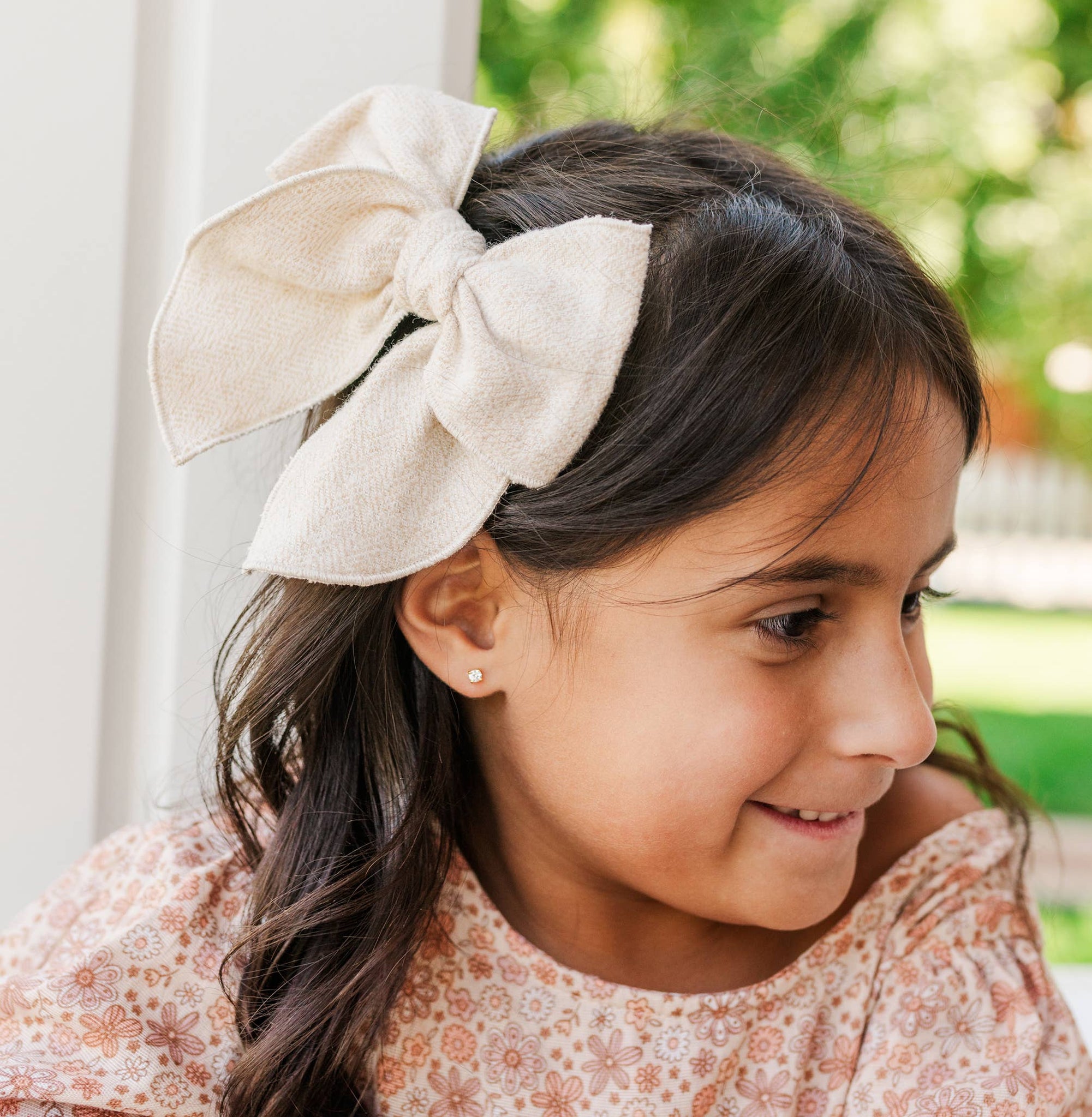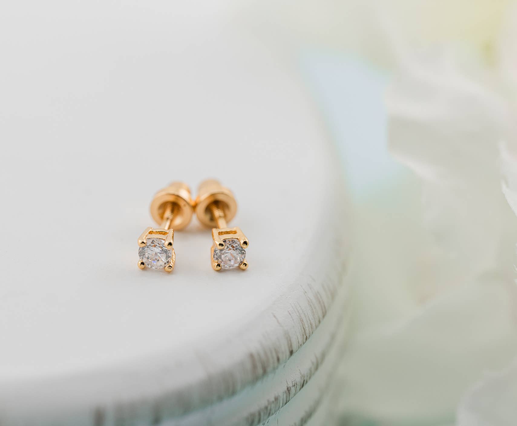 Girls 14K Gold-plated (over sterling silver) clear crystal earrings with sparkling CZ stones for children. These are perfect for newborn baby earrings, toddler jewelry, kids new pierced gold screw back earrings. 🌸Earrings are hypo-allergenic and should not irritate sensitive ears and have shortened posts for kids so they don't poke the backs of her ears. 🌸These earrings come with safety screw-back closure so they are secure and protect the backs of their little ears. These were created with our original screw back system designed to keep the earrings secure and prevent them from coming off or becoming lost.