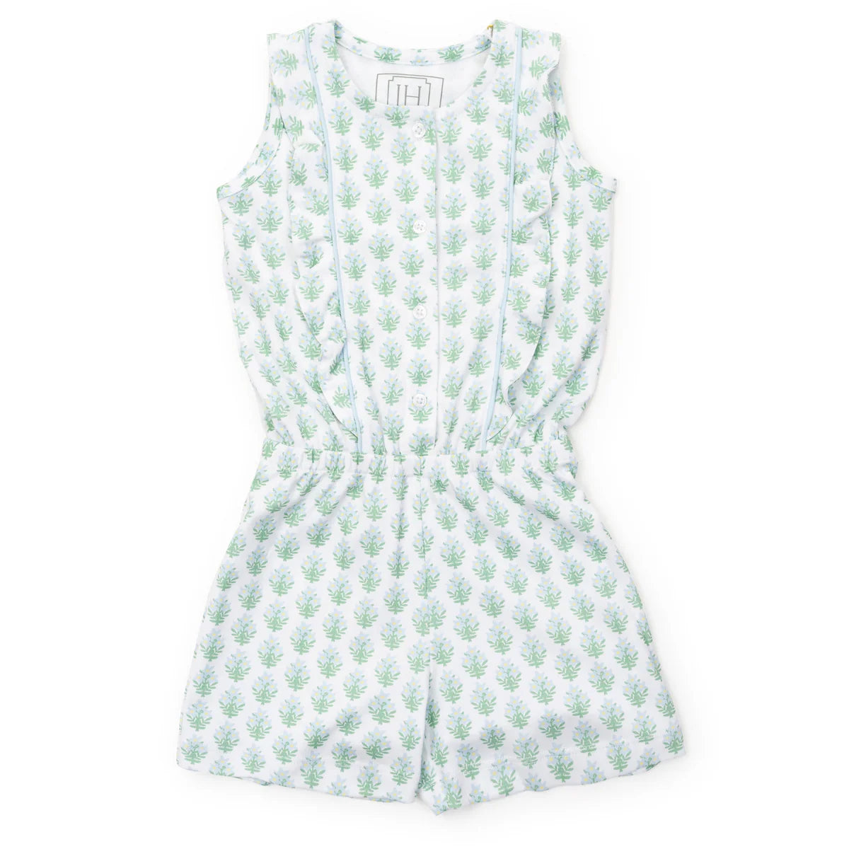 Girls' sleeveless pima cotton romper with ruffle detail down the front. Romper buttons down the front and has an elastic waistband.Made from 100% Peruvian Cotton.