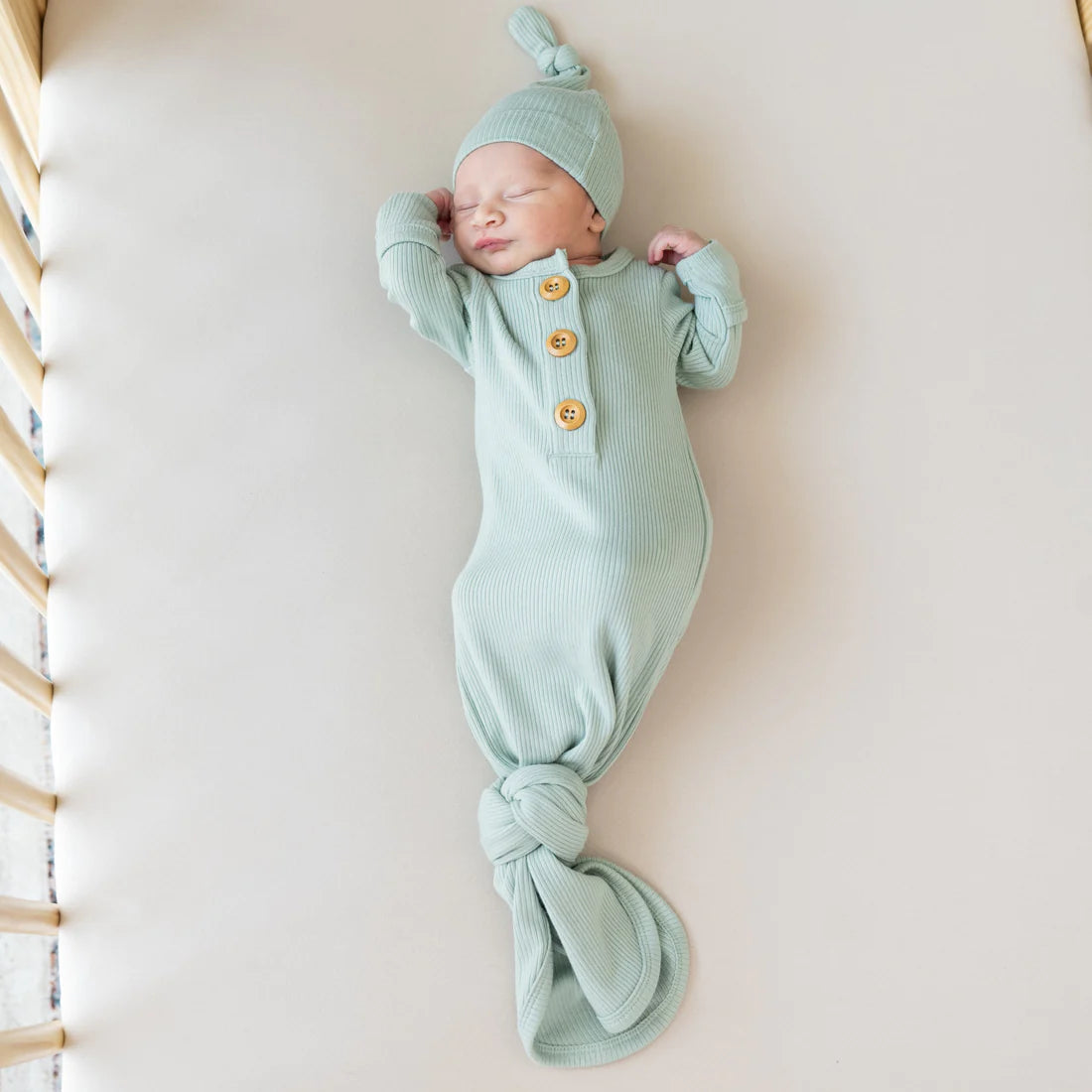This all-in-one outfit is the softest newborn essential designed with both you and your baby in mind. Crafted from soft, stretchy ribbed bamboo, this gown features a tie bottom for easy diaper changes and comes with a knotted turban for the finishing touch to a classic look.