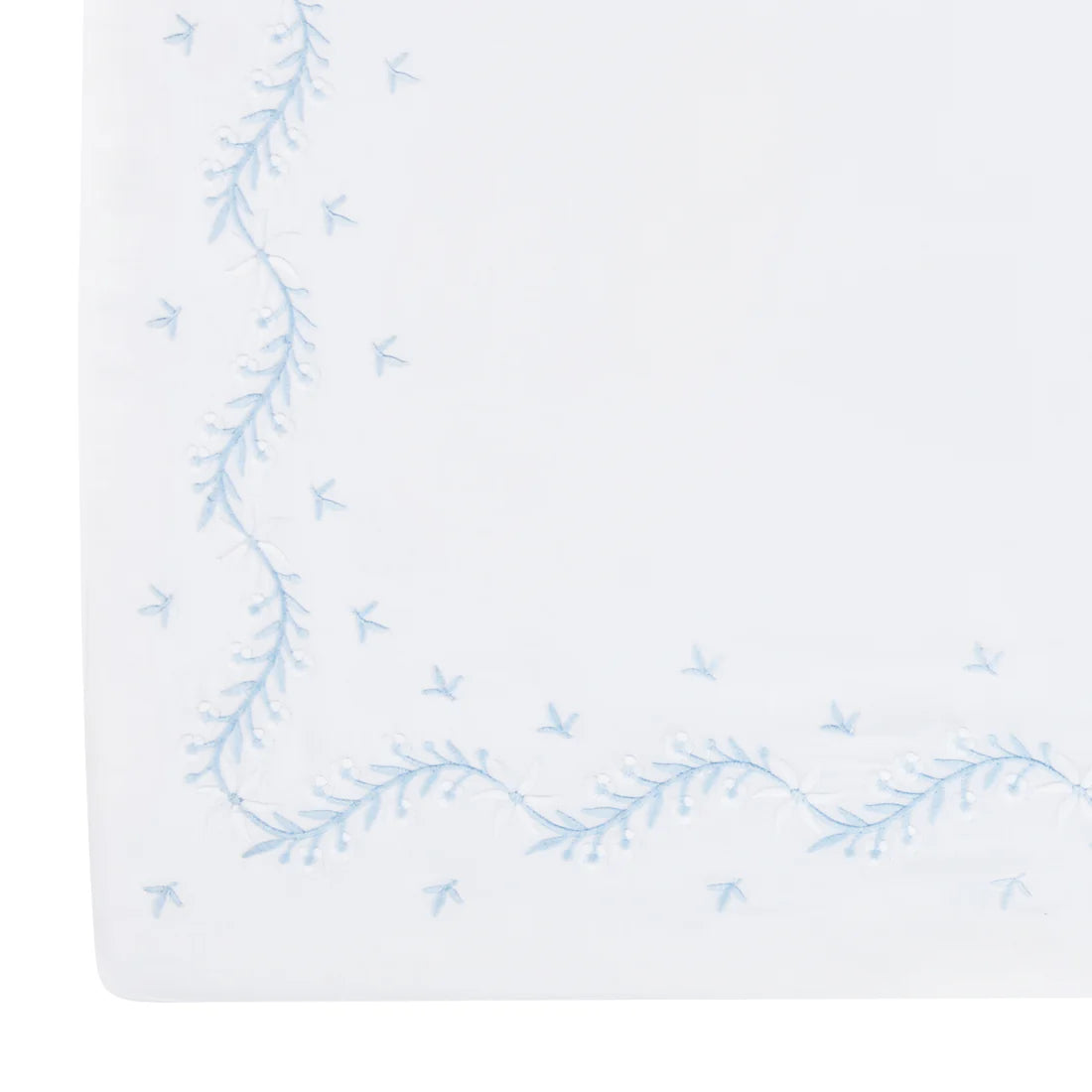 Designed to be admired, our bedding collection features beautifully embroidered pieces that are the perfect finishing touch to any little one's nursery. Our Embroidered Crib Sheet - Sky features a crisp white cotton backdrop with light blue and white floral vines delicately embroidered along the edges. Pair with our matching Embroidered Crib Skirt for a look that's equal parts charming and elegant. Add a monogram for an extra personal touch!