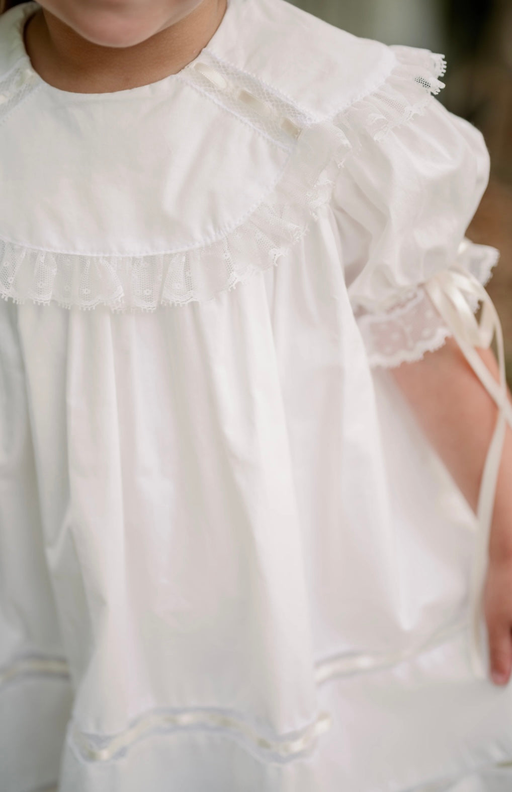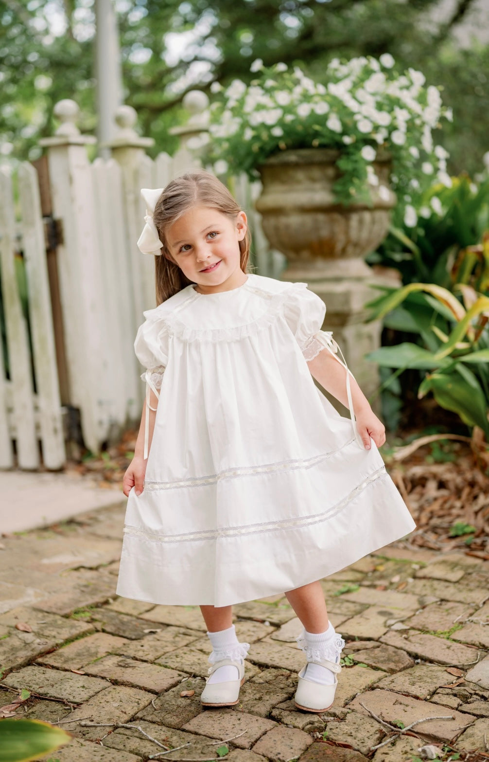 Watch your little girl exude an angelic charm in her Blessings White Batiste Donahue dress. It's adorned with exquisite lace trim and delicate ecru satin ribbon details, creating a elegant look for every occasion. And best of all, there is additional fabric, so the hymn can be let out as she grows!