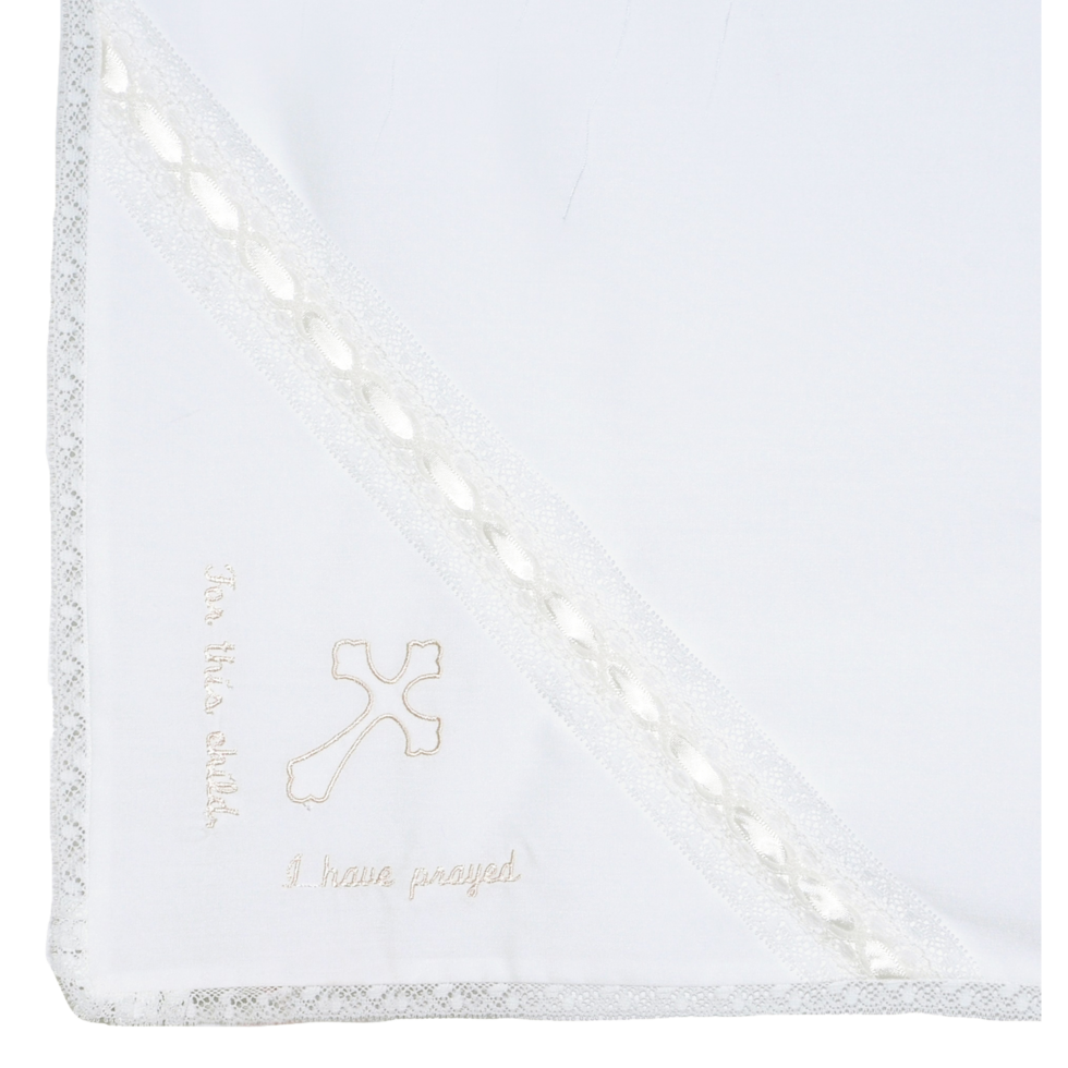 White batiste with lace trim and cross- for this child I have prayed embroidery and ecru satin ribbon