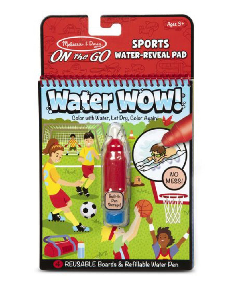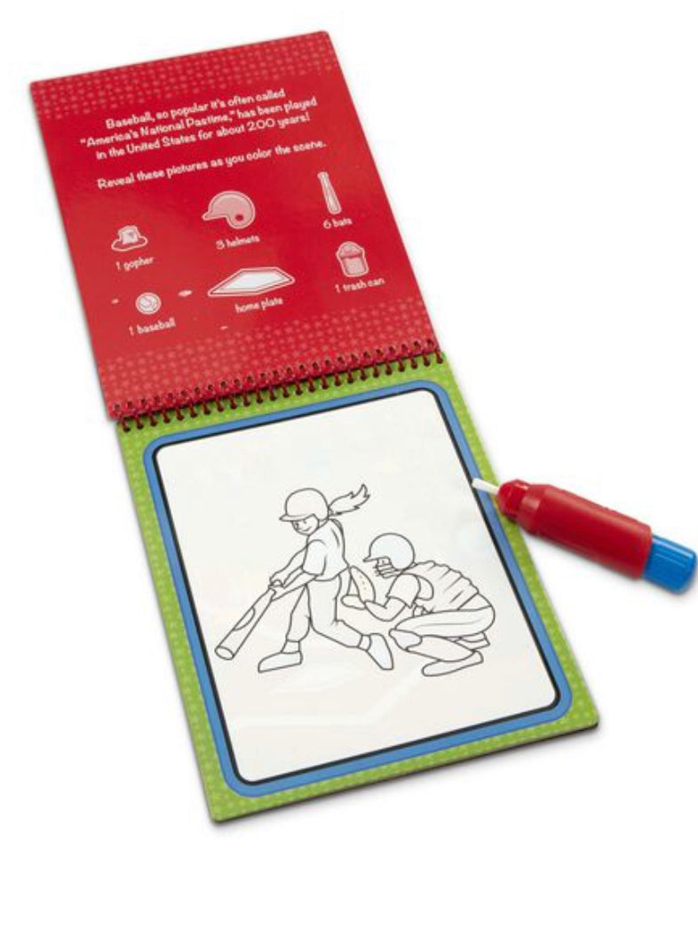 4 spiral-bound sports-themed coloring boards (basketball, baseball, swimming, soccer) and refillable water pen