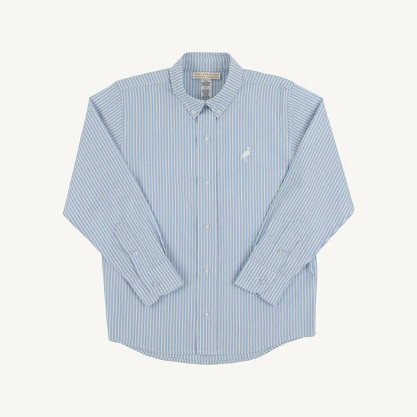 Our Dean's List Dress Shirt in Barrington Blue Tally Ticking Stripe with Worth Avenue White brings timeless preppy style to his wardrobe. This classic boys' dress shirt features crisp stripes and quality tailoring that's perfect for special occasions, school events, or any time he needs to look his best. Designed with attention to detail and crafted for all-day comfort, it pairs beautifully with dress pants, khakis, or coordinating pieces for a polished look.