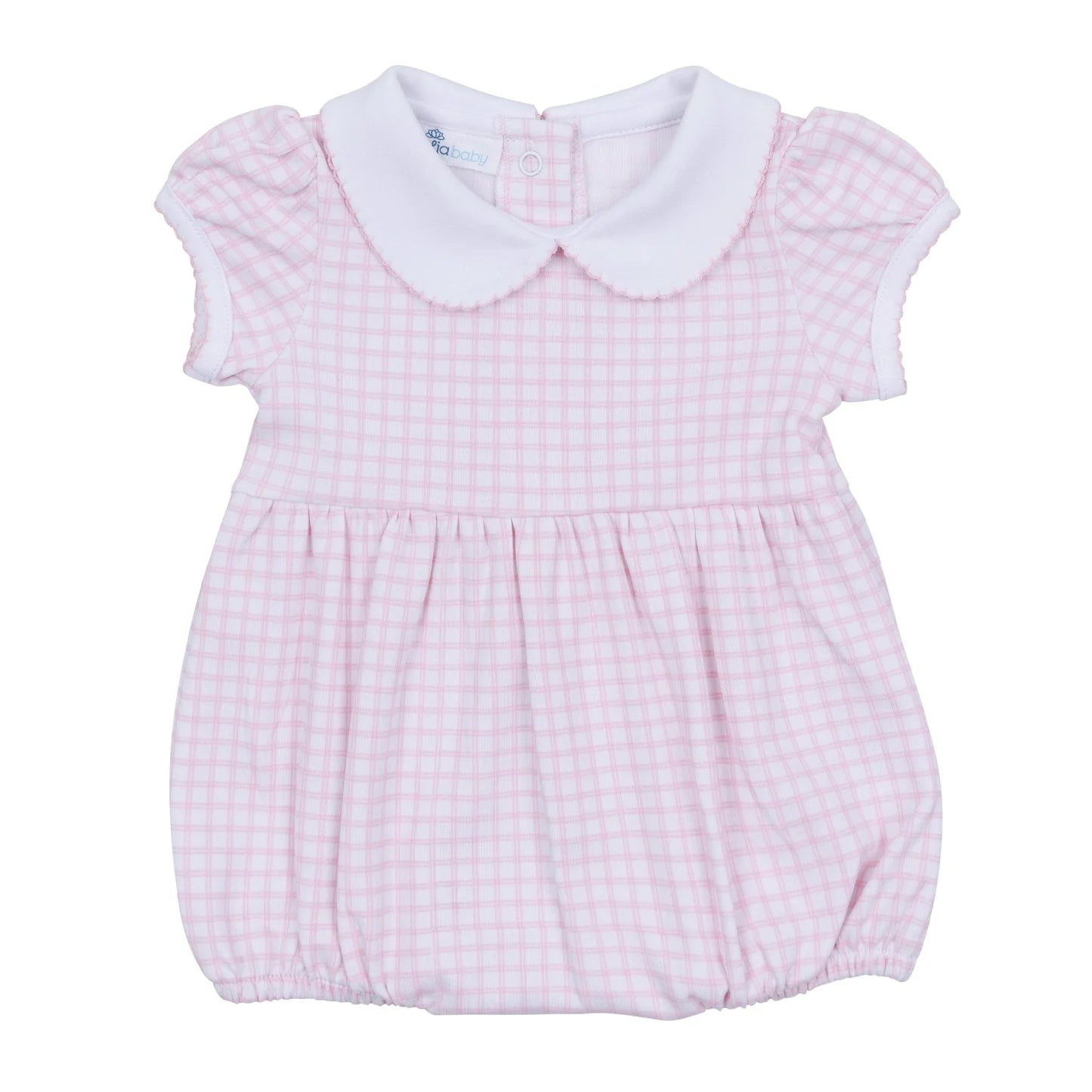Create joyful moments with our Peek-A-Boo Wishes Collared Bubble in pink, crafted from the most luxurious Pima cotton. This adorable bubble features delicate pink picot trim and a charming check pattern, perfect for spending quality time with family, visiting loved ones.