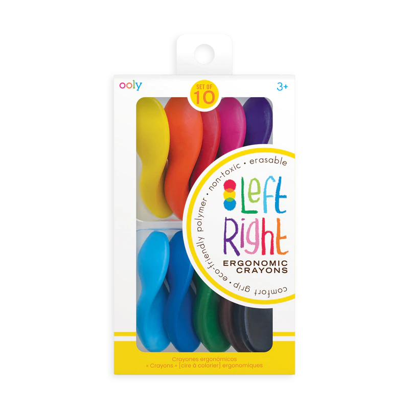 Are you right handed? Left handed? Ambidextrous? It doesn't matter with Left Right Crayons, they are ergonomic for everyone! These easy-to-hold crayons make drawing works of art comfortable and fun. Left Right Crayons are made with an eco-friendly polymer, are nontoxic and completely erasable. Set of 10 beautiful colors.