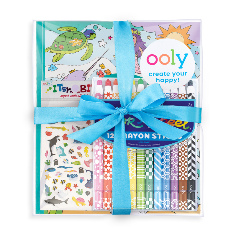 Underwater adventures await with this coloring gift set of Mermaids, narwhals, smiley fish, and turtles. This coloring set comes with theOutrageous Ocean Coloring Book, Color Appeel peelable crayon set and a Marine Friends Itsy Bitsy sticker sheet. To make them come to life, just add some color!