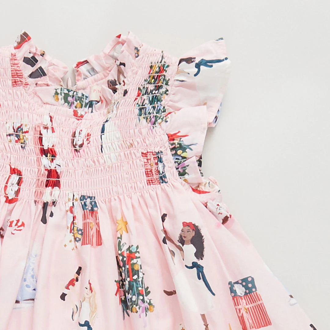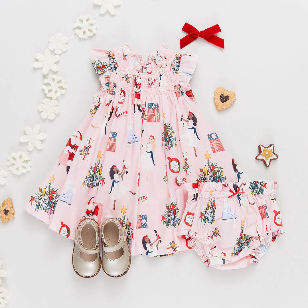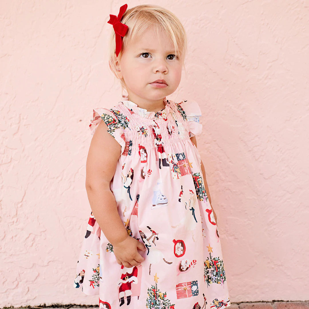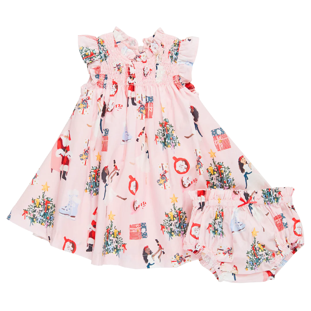 Joy To The World! Your holiday favorites have starring roles in our fun and festive Holiday Spirit print from artist Nysha Lilly. Ice skates, Santa Claus and trees dripping with tinsel come together on a perfectly pink ground. Nostalgic details include smocking at the chest and softly ruffled sleeves and neckline. Includes a matching diaper cover with a fixed red ribbon at the waist. Zips up the back.