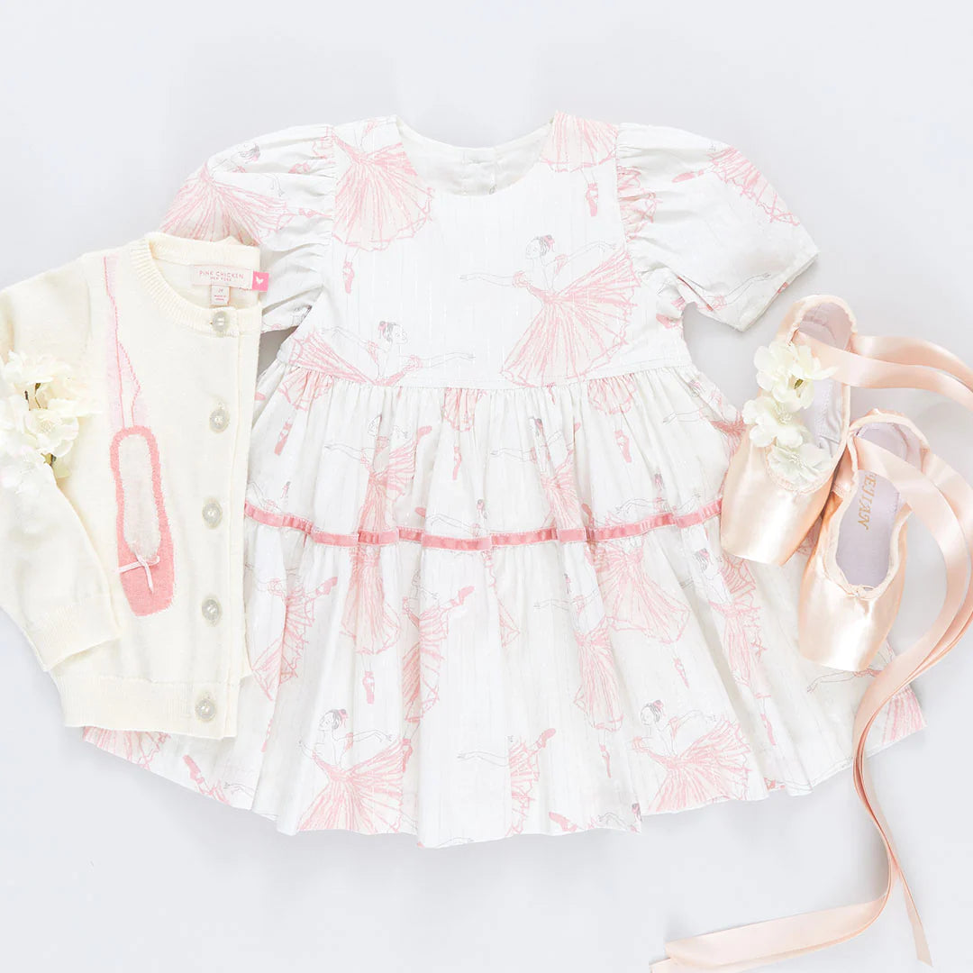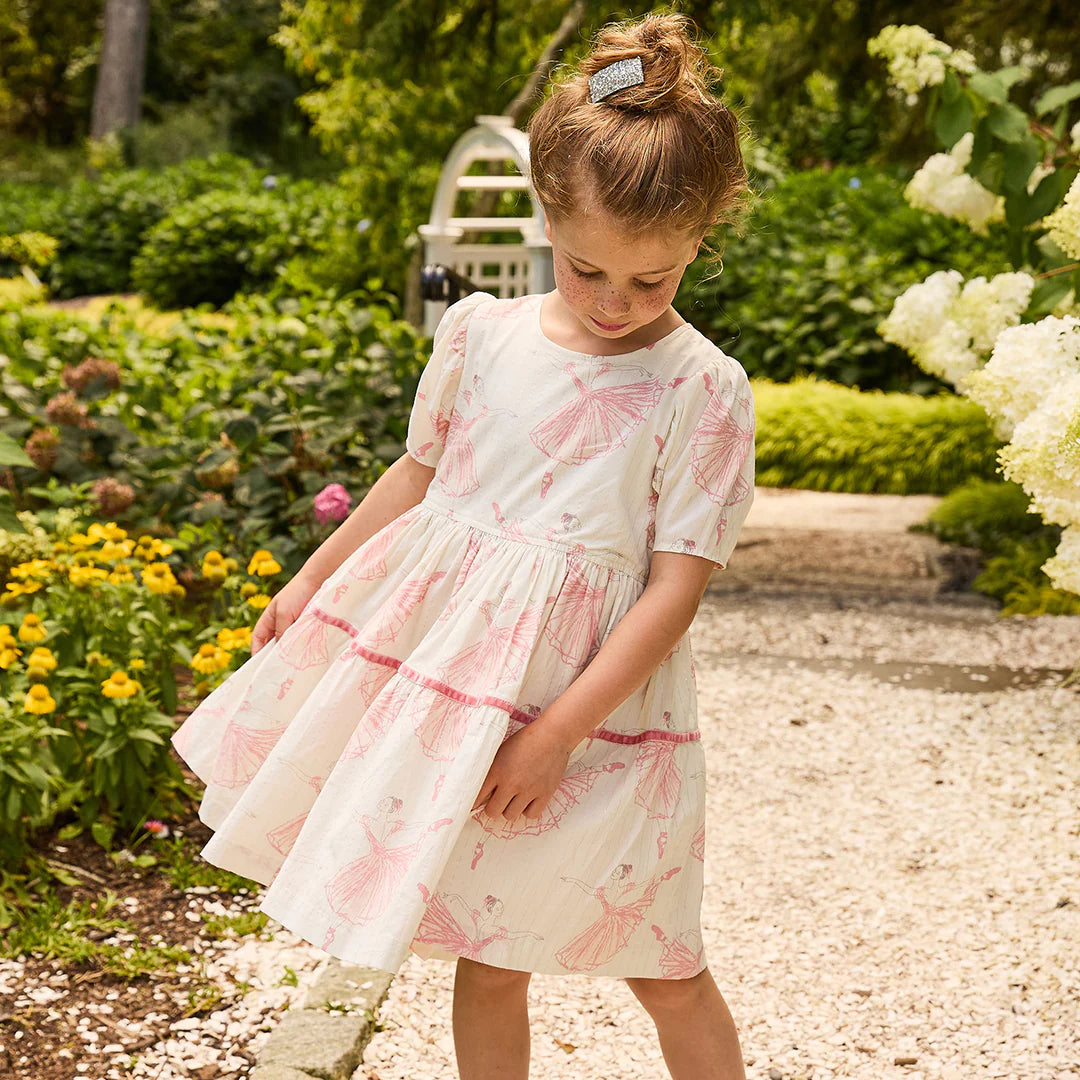 New Silhouette! Beautiful long lined ballerinas stretch and leap across our classically styled Girls Meredith Dress in our pretty new Ballerinas print. Perfectly Pink Chicken details include a fully gathered 2-tiered skirt, short puff sleeves and a pink velvet ribbon accent at the hip. A silver metallic thread detail shines throughout the piece. Your little dancer will surely want to twirl away the afternoon in this lovely dress.