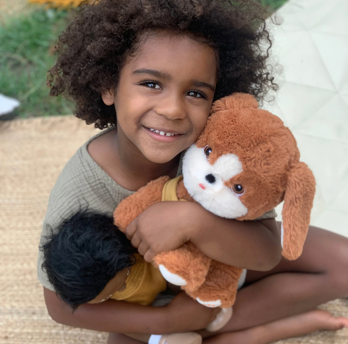 Made from soft plush fabric that is 100% recycled with velvety ears to nuzzle, Buddy is fully poseable and can stand, lay down and even sit! Buddy's head moves and is embroidered with the sweetest doggy face, plus there's a rainbow surprise on one of Buddy's little paws!