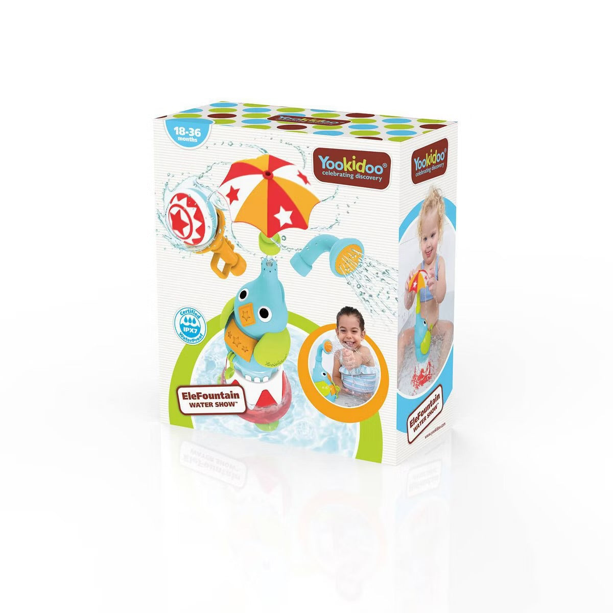 This battery-operated elephant fountain bath toy, along with four accessories, brings a circus vibe to bath time with surprising water effects and a spinning ball.