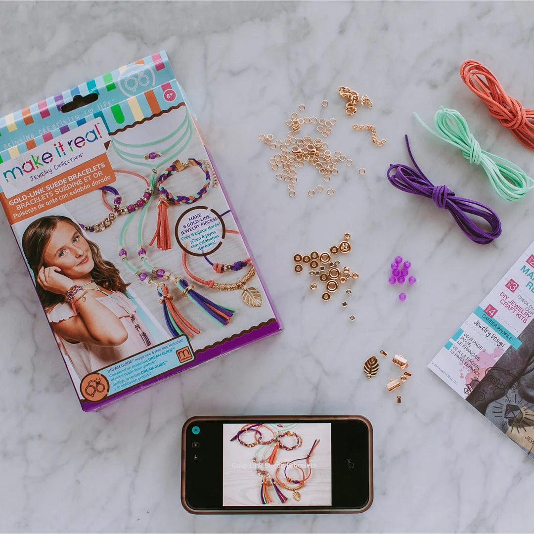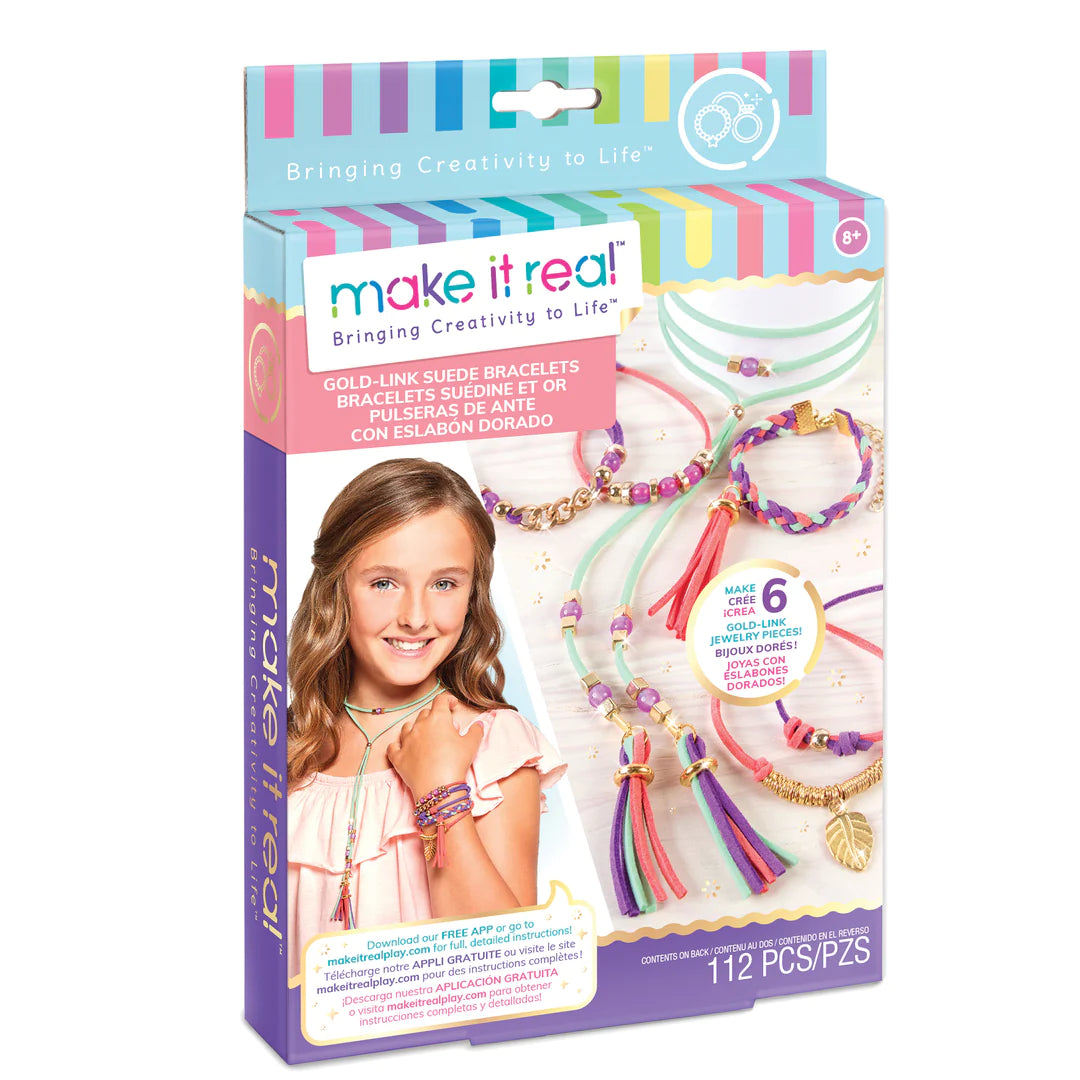 Create five trendy, sophisticated faux suede bracelets and a beautiful choker.Includes:3 colors of faux suede cord 4.5 m (4.9 yd)66 gold jewelry pieces38 assorted beads2 Curb chains1 gold charm1 instruction sheet1 PlayTray