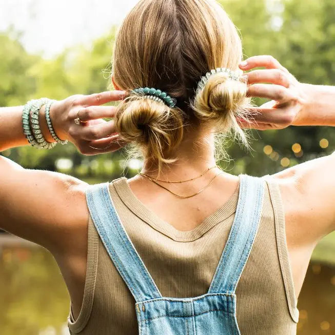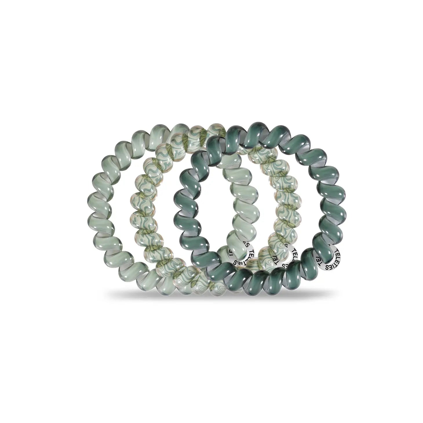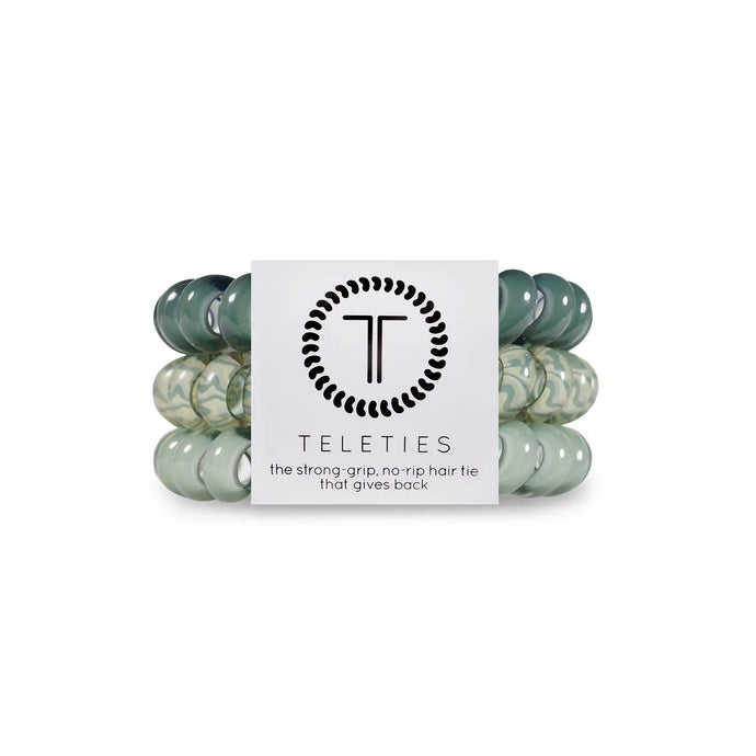 Hold your hair and enhance your style with TELETIES. The strong grip, no rip hair tie that doubles as a bracelet. Strong, pretty and stylish, teleties are designed to withstand everyday demands while taking your look to the next level. Sold in packs of three. The large size is 6.5cm wide x 1cm thick.
