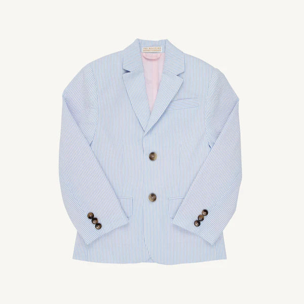 Our Grandccasion™ Booker Blazer in Breakers Blue Seersucker brings classic seersucker texture and tortoise shell button details that elevate his look from everyday to extraordinary. Whether he's headed to a spring celebration, family gathering, or just wants to look his absolute sharpest, this timeless piece delivers polished style that makes every moment feel special. Preppy perfection!