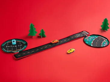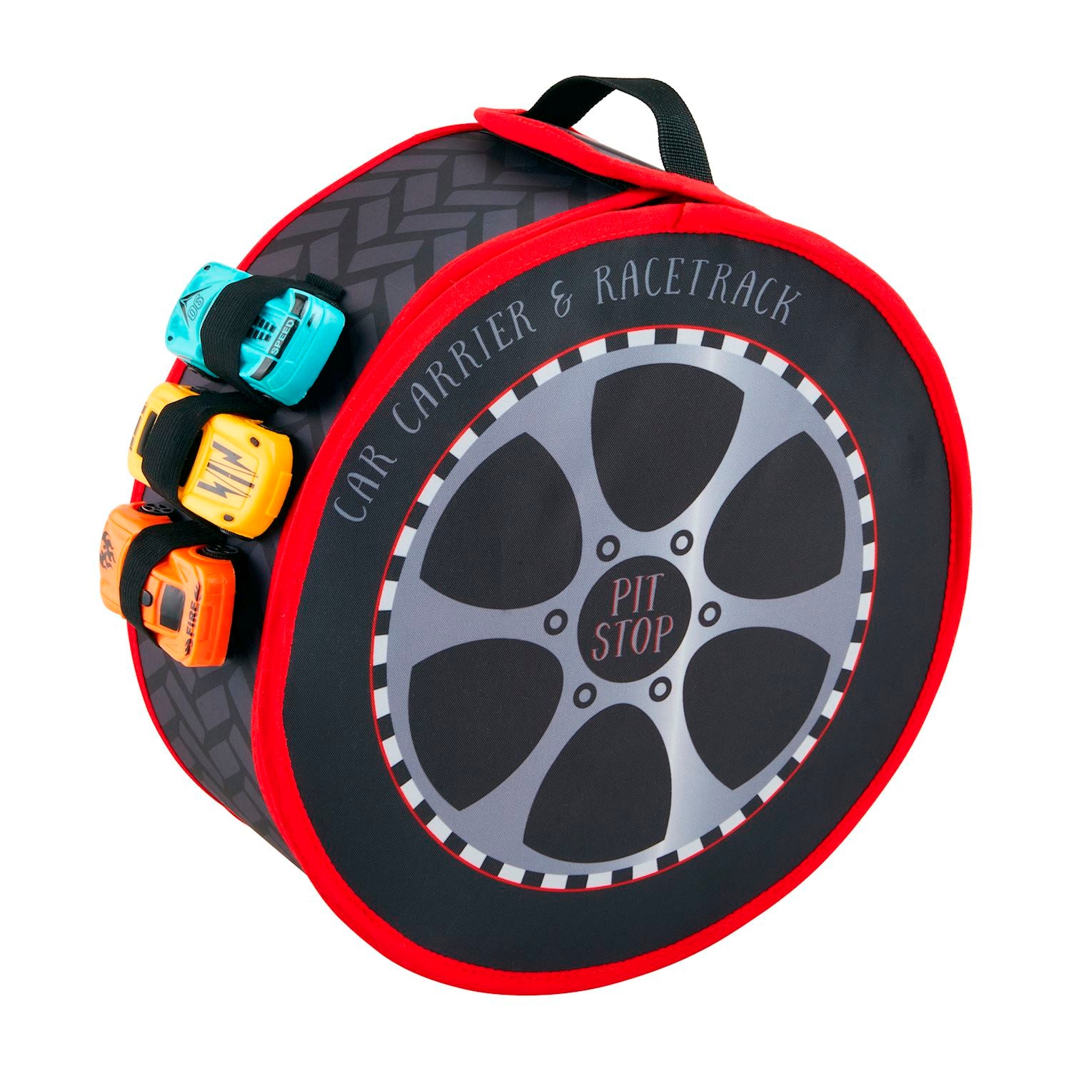 4-piece set: Car storage carrying case unzips to create racetrack and parking lot. Comes with 3 pull-back toy cars. Ages 3+
