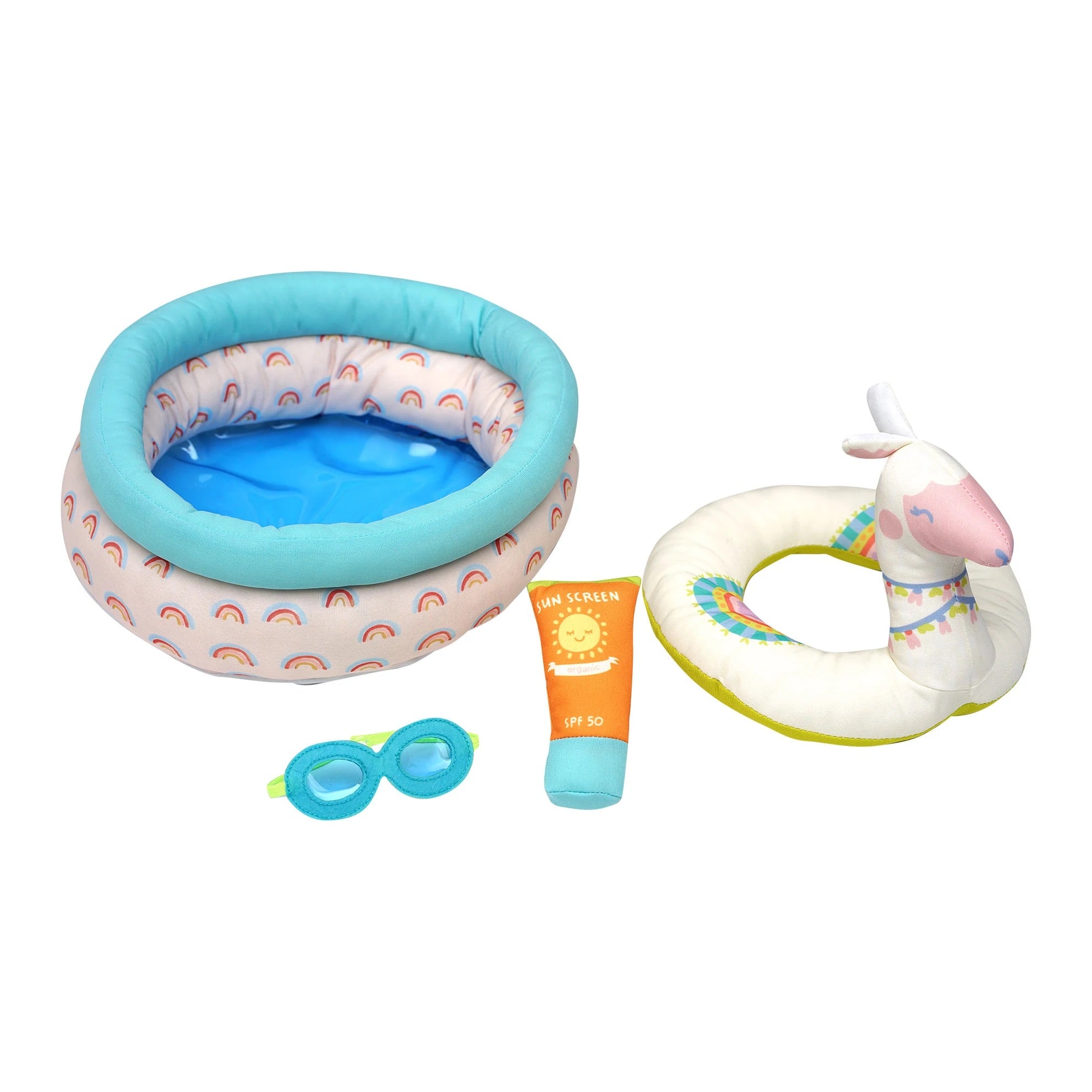 Splash into playtime with the Stella Collection Pool Party play set. This adorable four-piece pool-themed set includes: a soft toy pool with blue soft-plastic bottom and a soft llama ring, soft-tube pretend organic 50 SPF sunscreen, and baby blue goggles! (dolls and swimsuit sets sold separately)