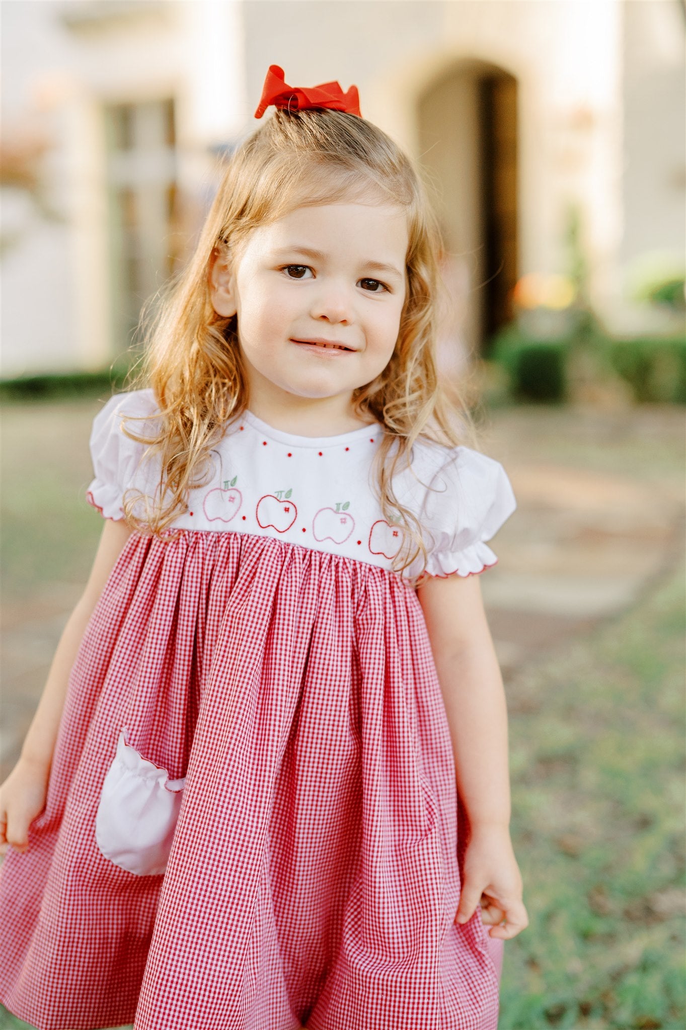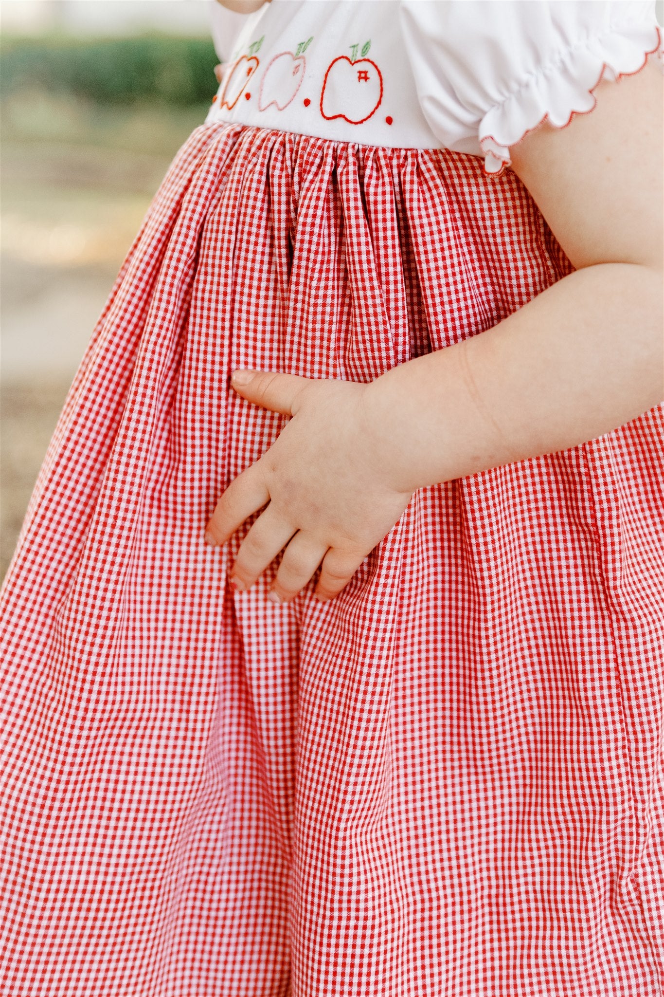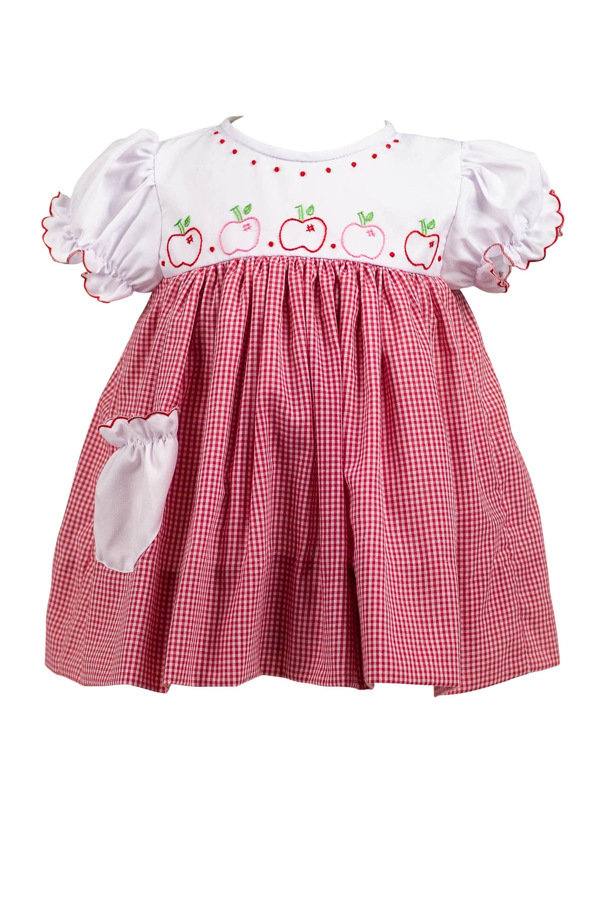 Red check dress with apple embroidery detail