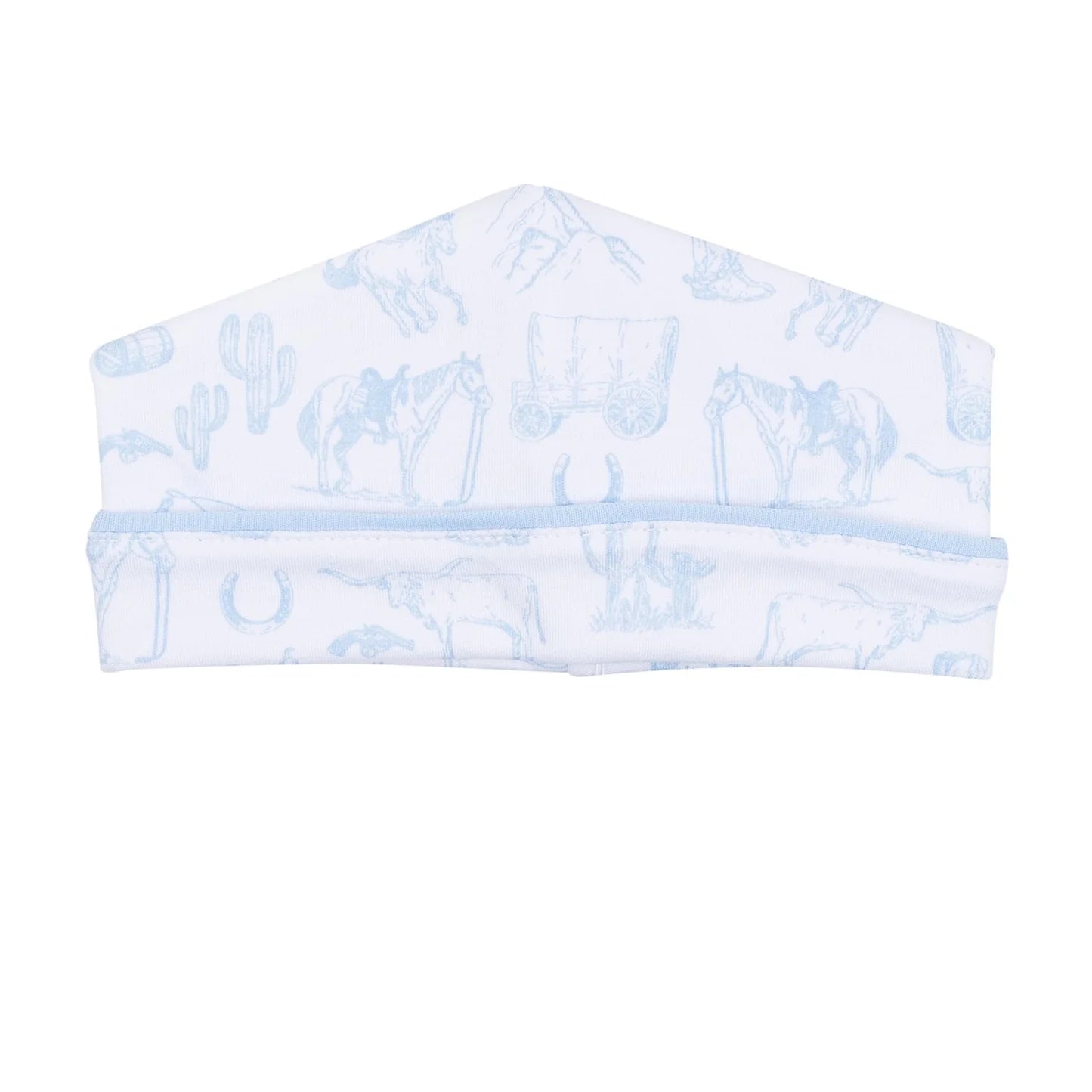 This charming hat, made from our luxurious Pima Cotton, is the perfect finishing touch. It features a full Wild West-themed toile print in light blue and is designed to keep little heads comfortable.
